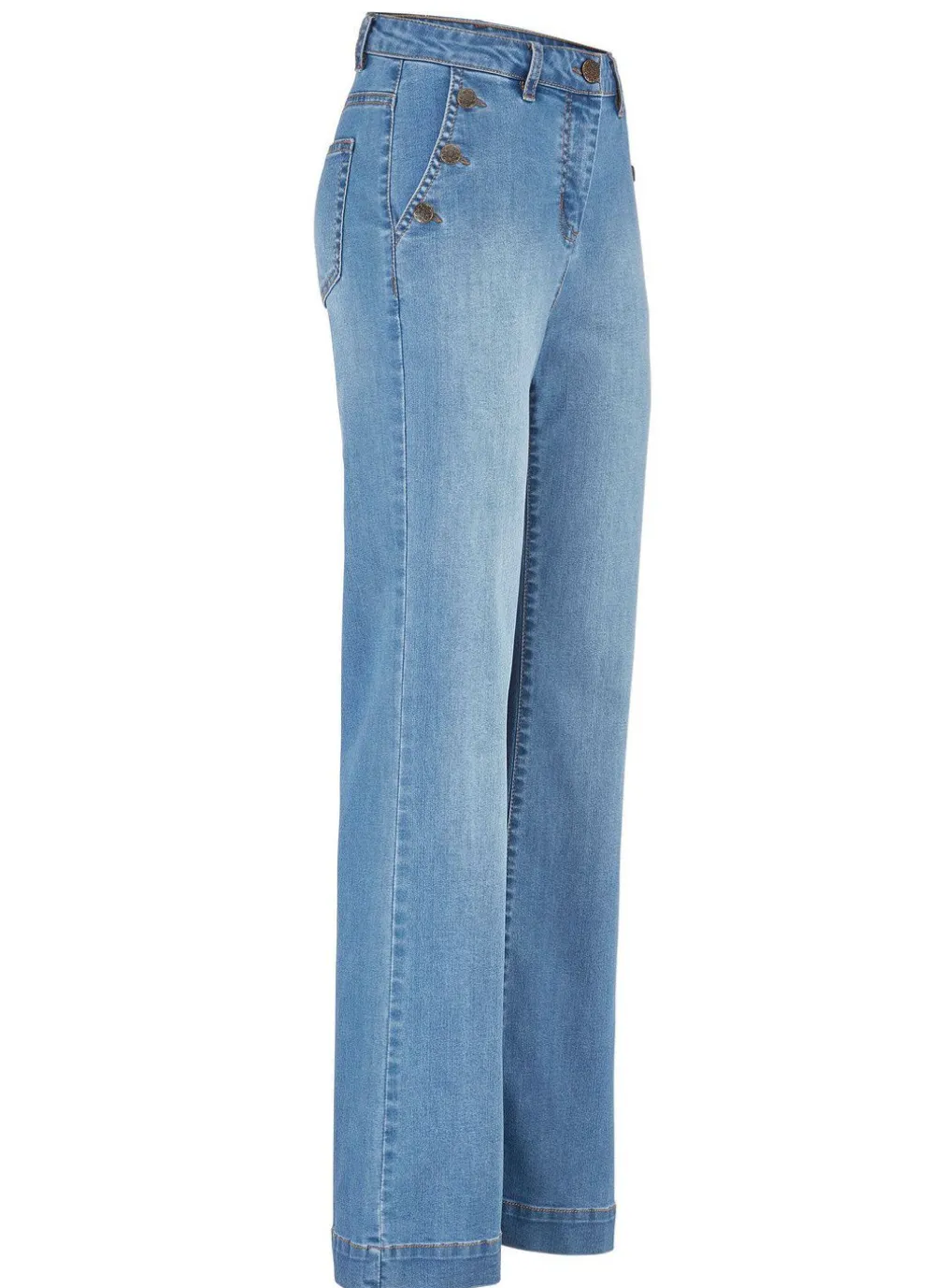 Fabelhafte Jeans in modischer Weite: elastischer Formbund, Knopf- und Reißverschluss, Seitentaschen mit Zierknöpfen, aufgesetzte Gesäßtaschen, Jeanssattel sowie breiter, abgesteppter Saumabschluss. Innenbeinlänge ca. 78 cm, Fußweite ab 48 cm.