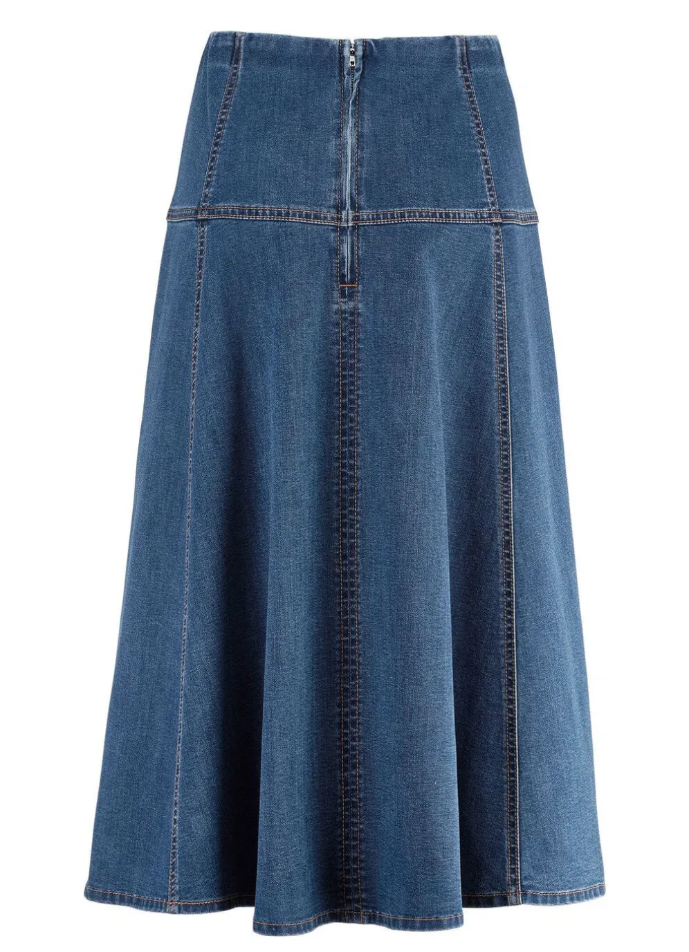 Angesagter 6-Bahnenrock in komfortabler Schlupfform, glatt anliegend dank des innenliegenden, unsichtbaren Rundum-Dehnbundes, Nahtreißverschluss mit Haken im Rückteil, breite Passe rundum sowie kontrastfarbene Teilungsnähte im Vorder- und Rückteil. Gesamtlänge ca. 76 cm.