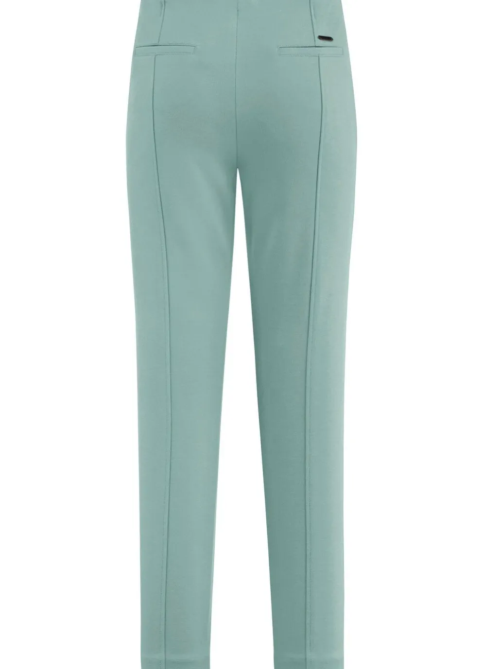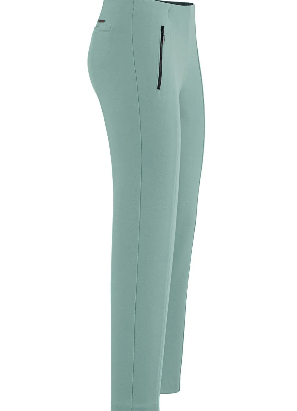 Knöchellange Jerseyhose: angeschnittener Bund, glatt anliegend dank der innenliegenden Gummibund-Einlage, Reißverschluss-Taschen vorne, streckende Teilungsnähte auf Vorder- und Hinterhose sowie paspelierte Gesäßtaschen. Innenbeinlänge ca. 72 cm, Fußweite ab 29 cm.