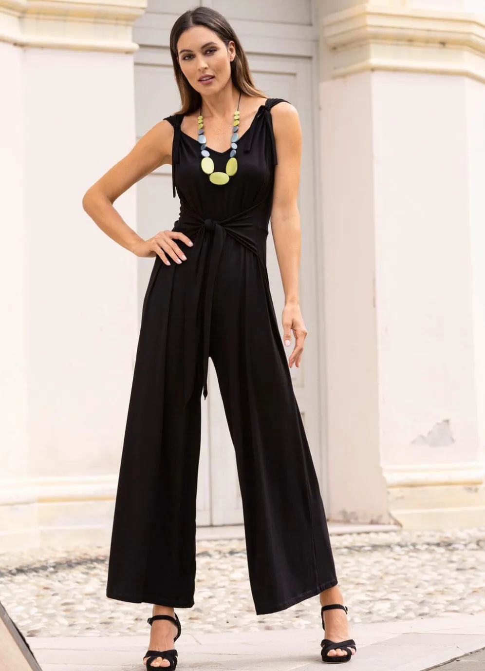 Ein absoluter Blickfang ist dieser angesagte Jumpsuit mit modischer Beinweite, V-Ausschnitt, Träger mit abnehmbarem Band sowie angenähter Hüftbindegürtel.