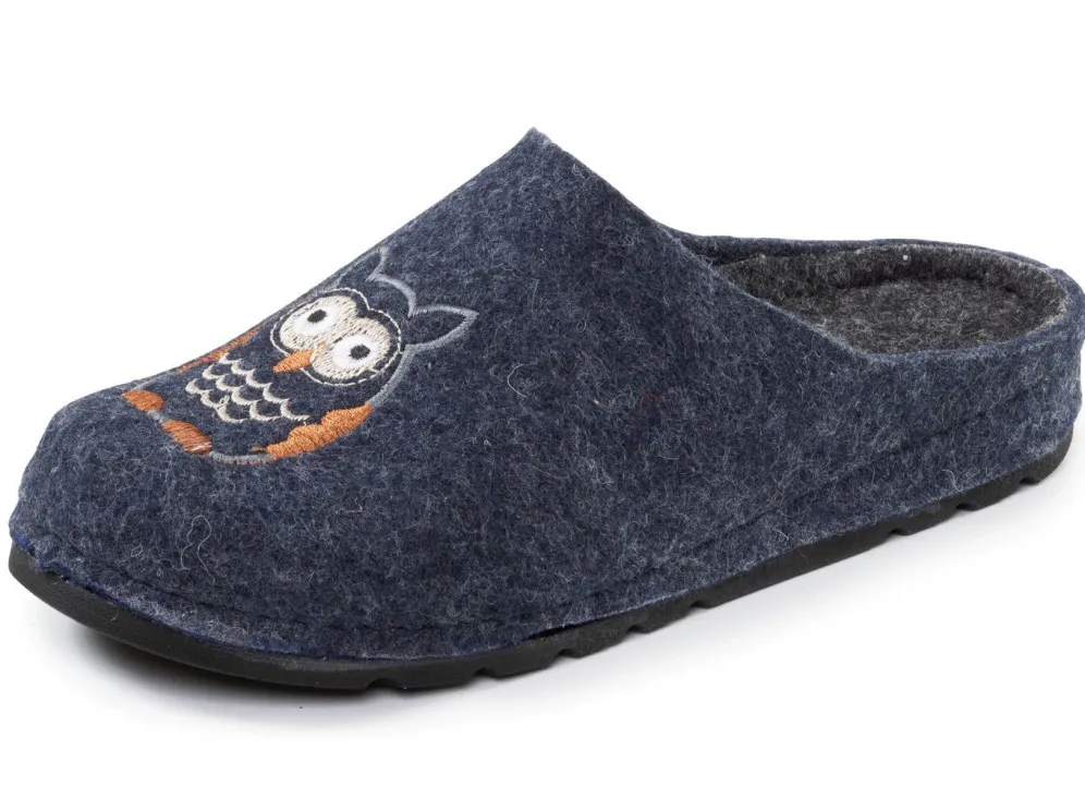 Hausschuhe aus Filzmaterial mit niedlicher Eulen-Stickerei, Filz-Fußbett, leichter PU-Profilsohle sowie 10 mm Keilabsatz
