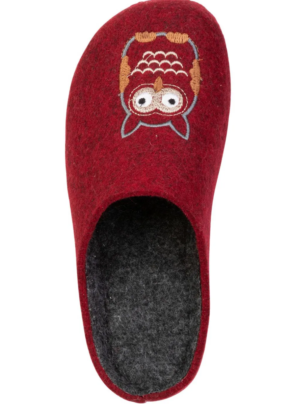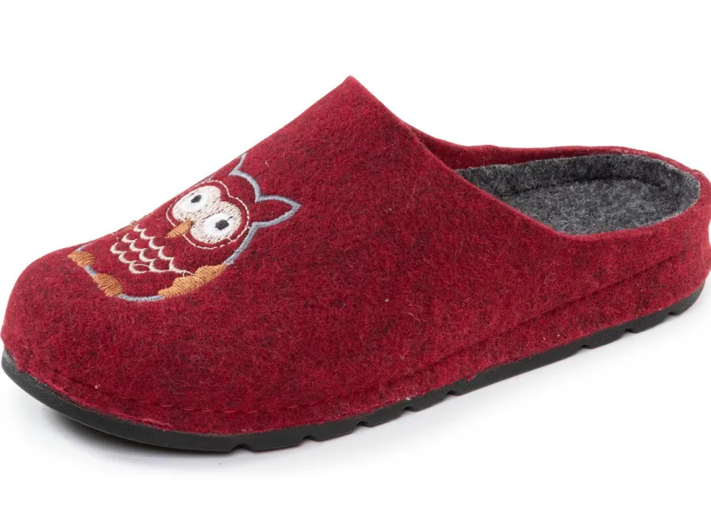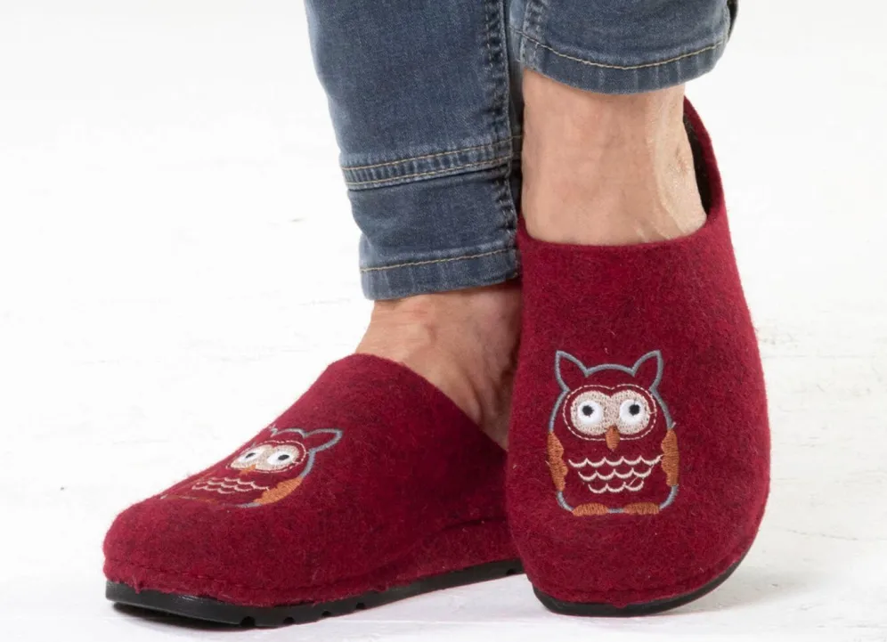 Hausschuhe aus Filzmaterial mit niedlicher Eulen-Stickerei, Filz-Fußbett, leichter PU-Profilsohle sowie 10 mm Keilabsatz