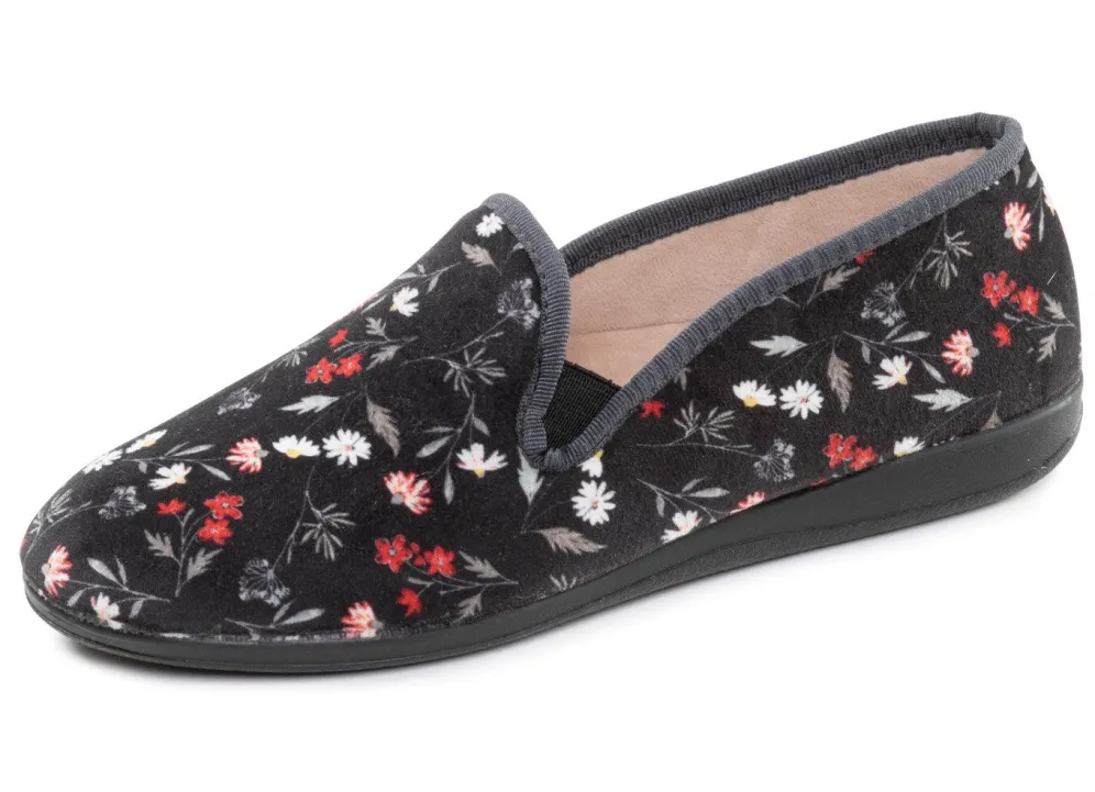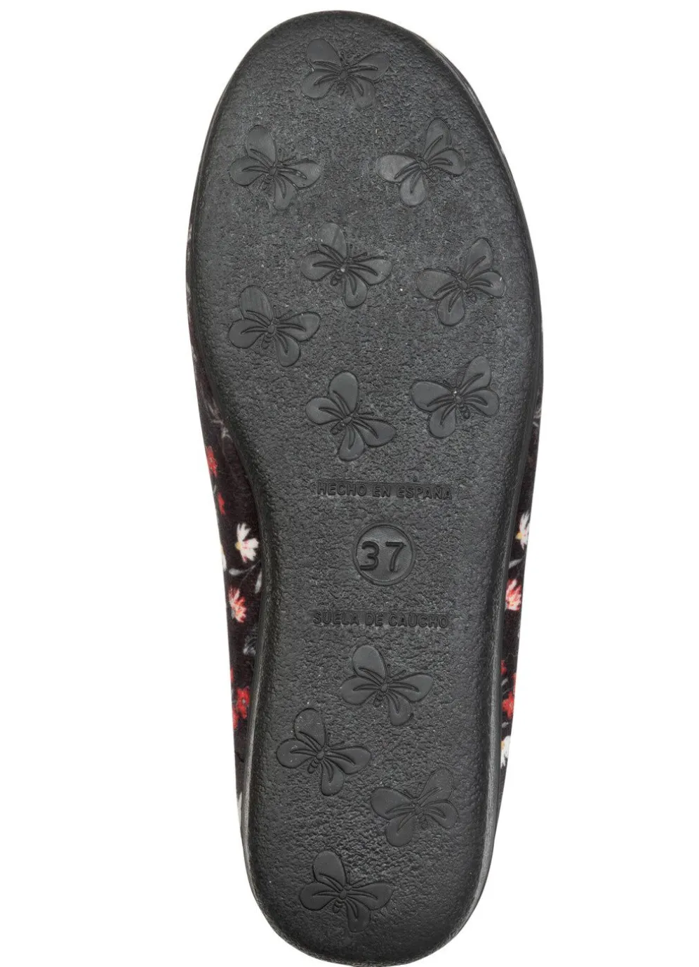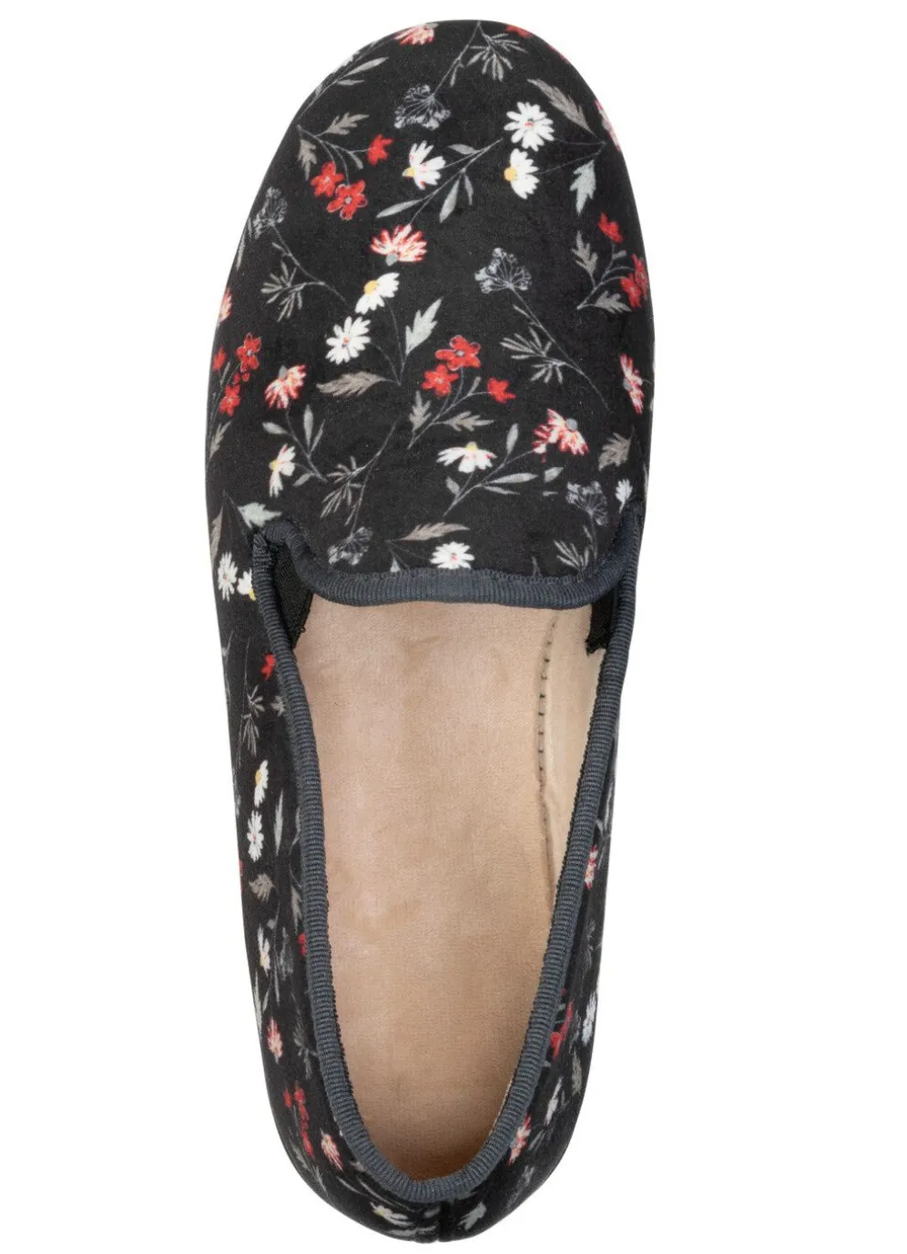 Hausschuhe aus floral bedrucktem Textilmaterial mit seitlichen Gummizügen: Futter und gepolsterte Decksohle aus weichem Samt, superleichte Gummi-Laufsohle sowie 15 mm Keilabsatz