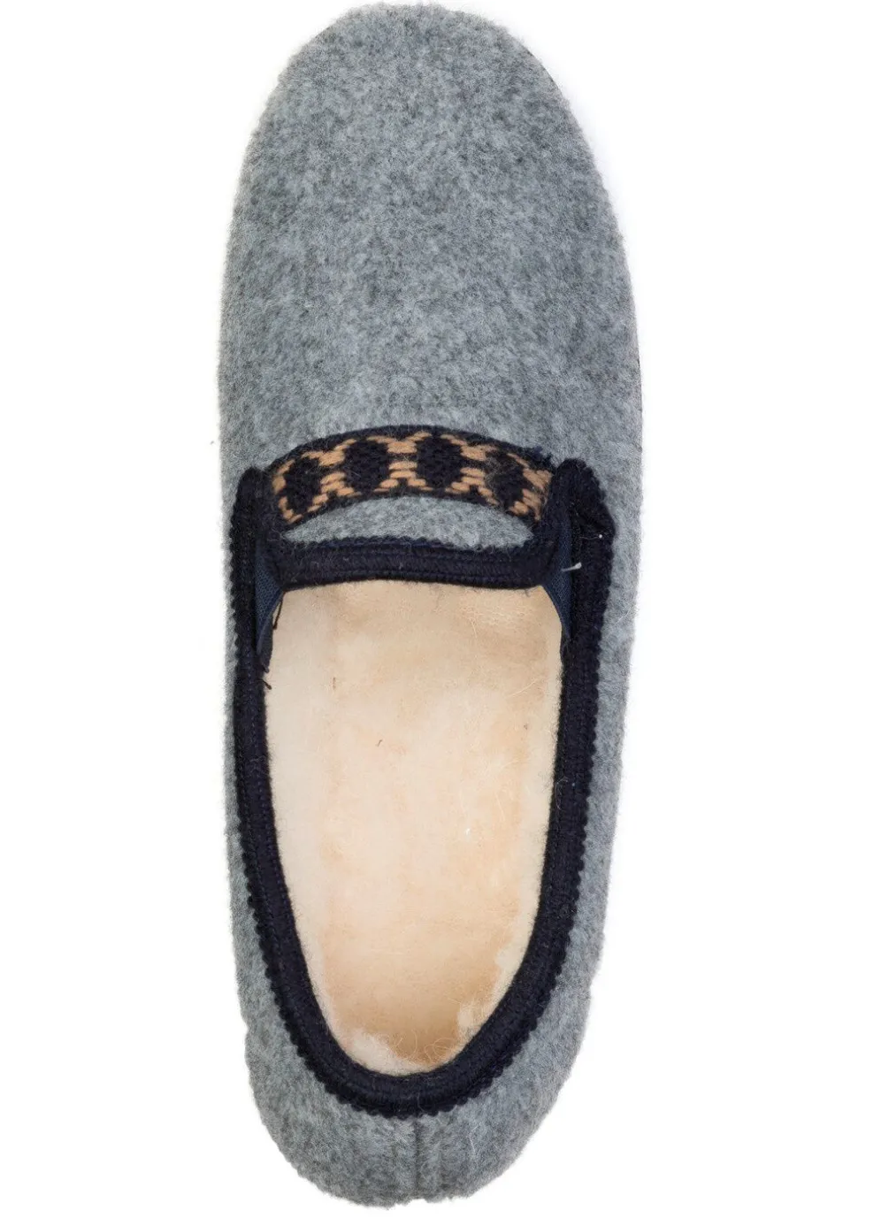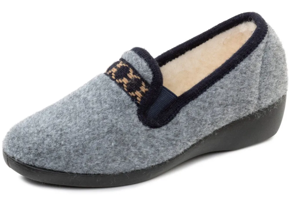 Hausschuhe aus Textil in Grau-Marine, mit gemusterter Bordüre und seitlichen Gummizügen: Warmfutter und Fußbettbezug aus reiner Wolle, leichte Synthetik-Laufsohle sowie 25 mm Keilabsatz