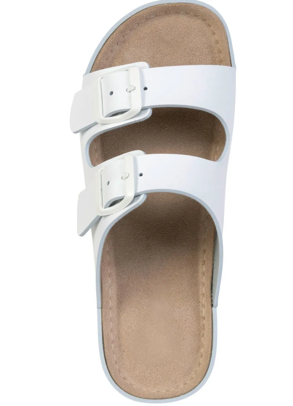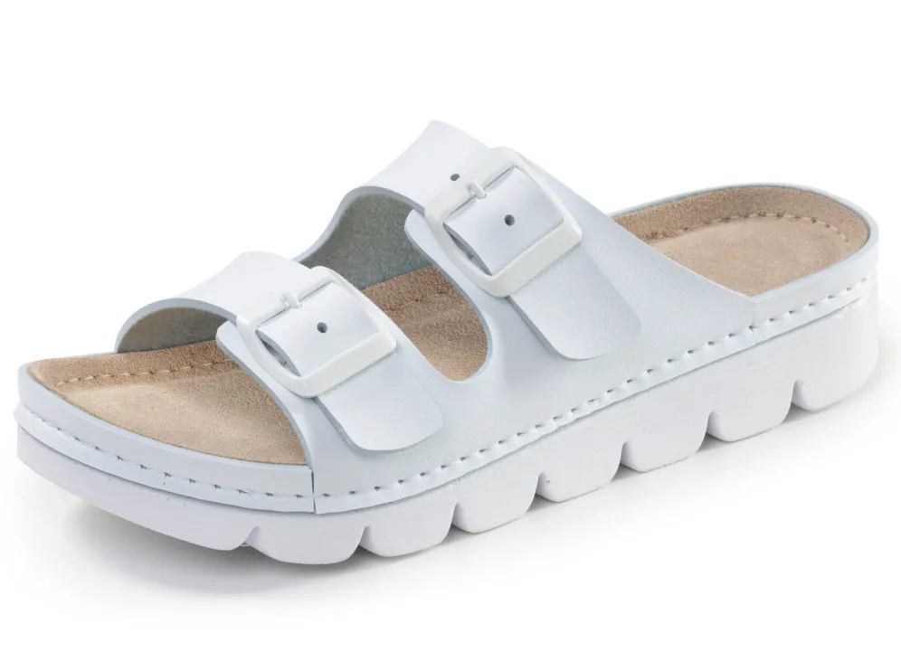 Trendige Pantoletten aus teilweise zart schimmerndem Synthetikmaterial: mit zwei verstellbaren Schließen, Futter, gepolstertem Lederfußbett sowie leichte PU-Profilsohle mit flachem Keil