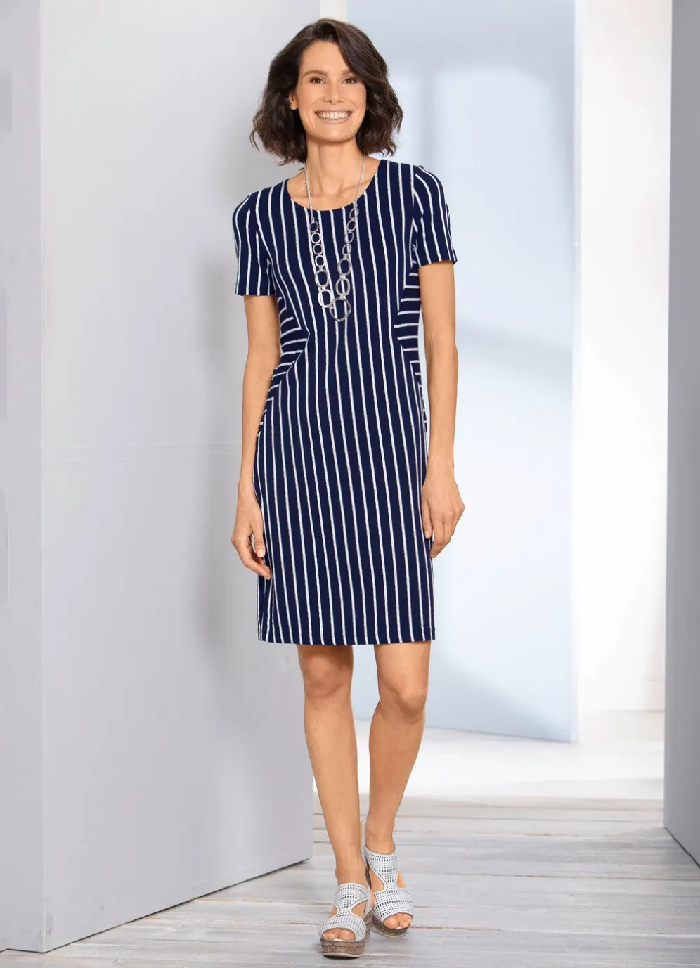 Tolles, leicht tailliertes, marine-weißes Kleid in Schlupfform und angesagter Streifenoptik: runder Halsausschnitt, kurze Ärmel sowie raffinierte, seitliche Einsätze im Vorder- und Rückteil.