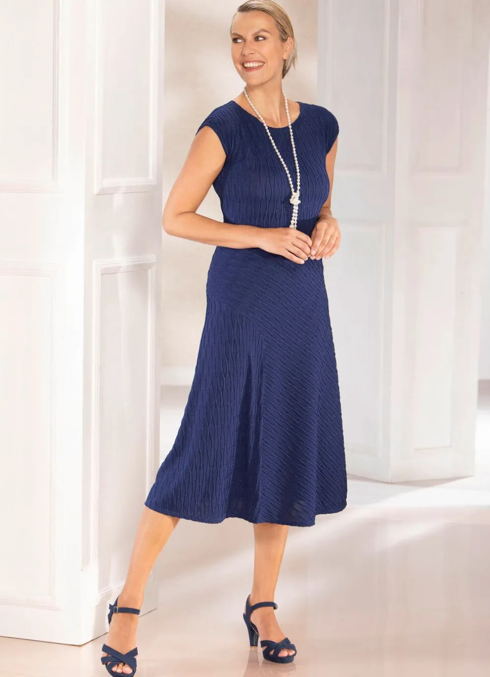 Bezauberndes blaues Kleid in leicht taillierter Schlupfform, mit rundem Halsausschnitt, überschnittener Schulterpartie, raffiniertem Einsatz im Vorderteil am asymmetrisch angesetzten Rockteil.