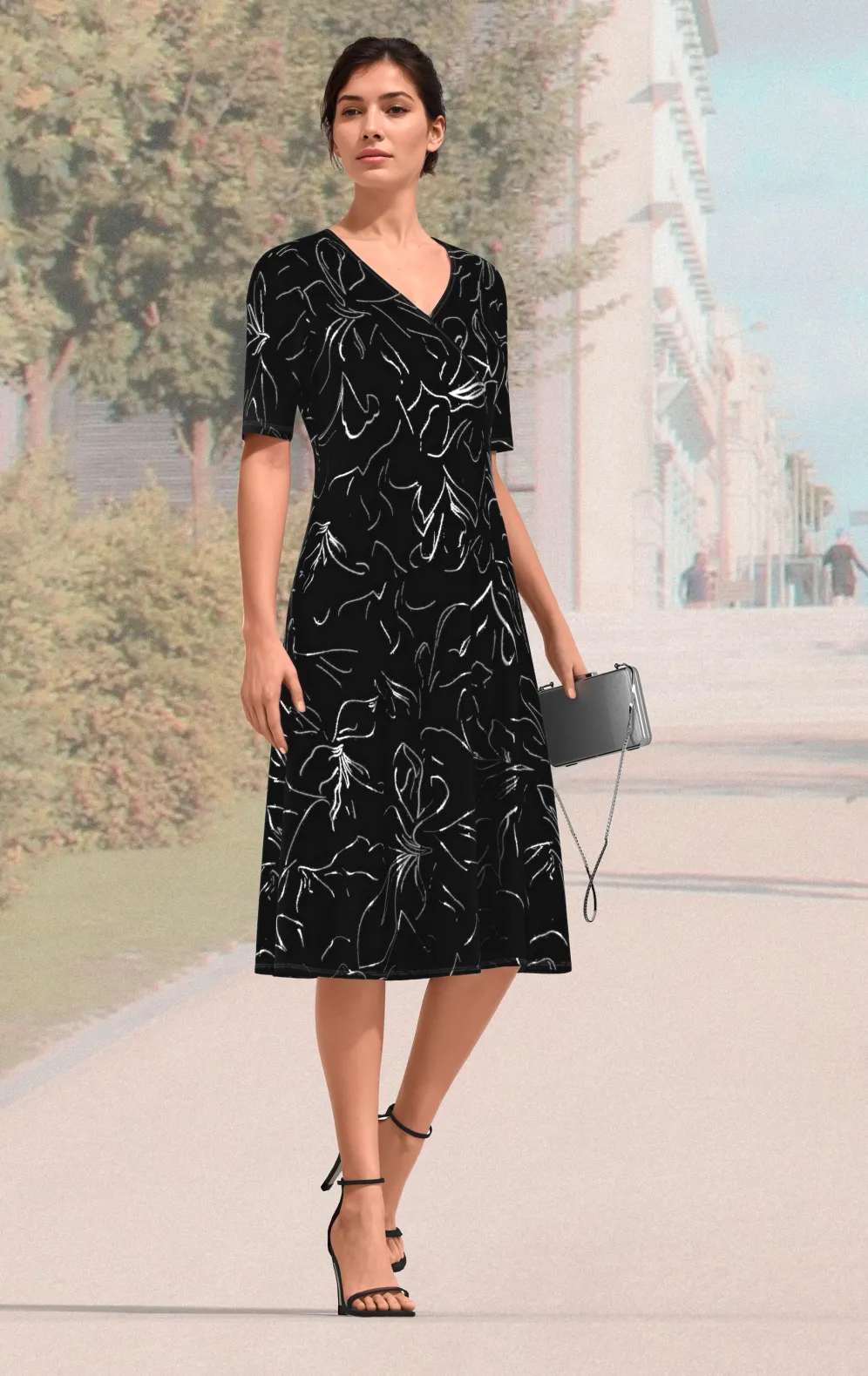Jedes Teil ein Unikat! Stilvolles, schwarzes Kleid in Schlupfform, eingefasster V-Ausschnitt an der angesagten Wickeloptik, kurzen Ärmeln sowie leicht ausgestelltem Rockteil.