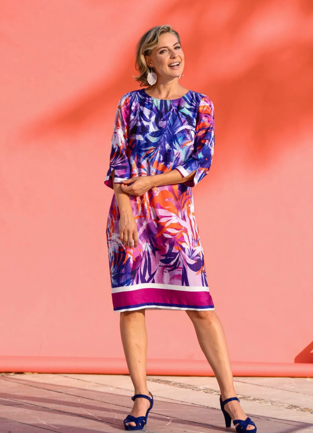 Attraktives, Figur umspielendes Kleid mit farbbrillantem, ausdruckstarken Bordürendruck in Koralle-Fuchsia-Rosé-Bunt, rundem Halsausschnitt, 3/4-langen Ärmel mit kurzem Schlitz am Armabschluss sowie Reißverschluss im Rückteil.