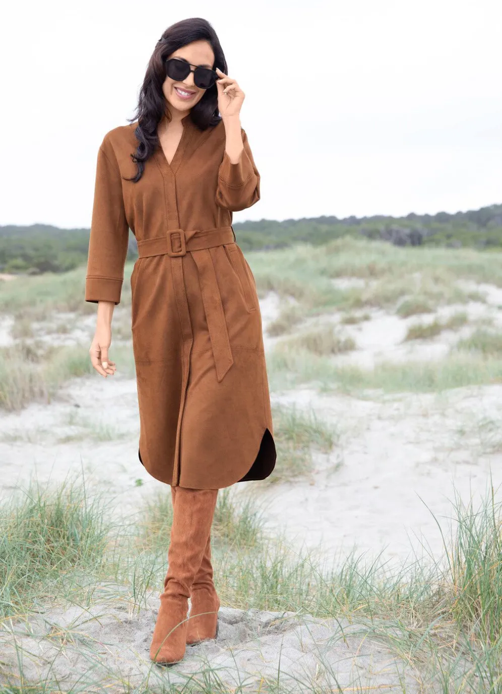 Ein absoluter Blickfang ist dieses Kleid mit Stehkragen am V-Ausschnitt, 3/4-lange Ärmel mit breitem Besatz an den Abschlüssen, durchgehende Knopfleiste, 2 Schubtaschen im Vorderteil, tolle, gelegte Falten im Rückteil, mit Gürtelschlaufen und Bindegürtel sowie seitlich abgerundeter Saum.