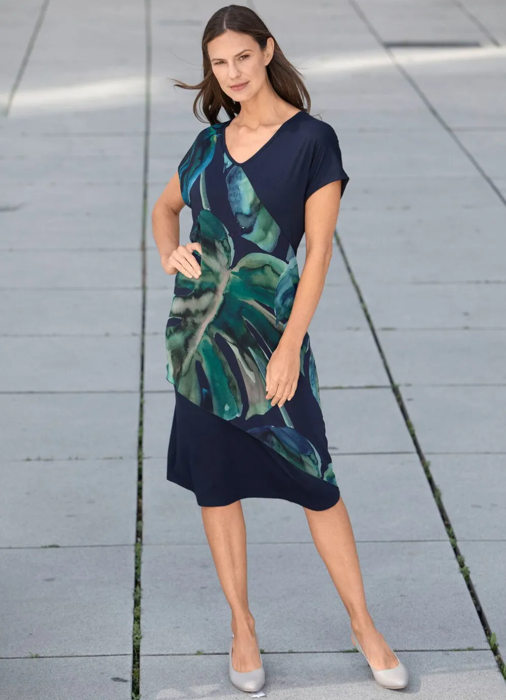 Kleid in Schlupfform mit farbbrillantem Inkjet-Druck in Marine-Grün-Taupe-Bunt, eingefasstem V-Ausschnitt, überschnittener Schulter, ausdruckstark dessiniertem Chiffon-Besatz im Vorderteil sowie leicht ausgestelltem Rockteil.
