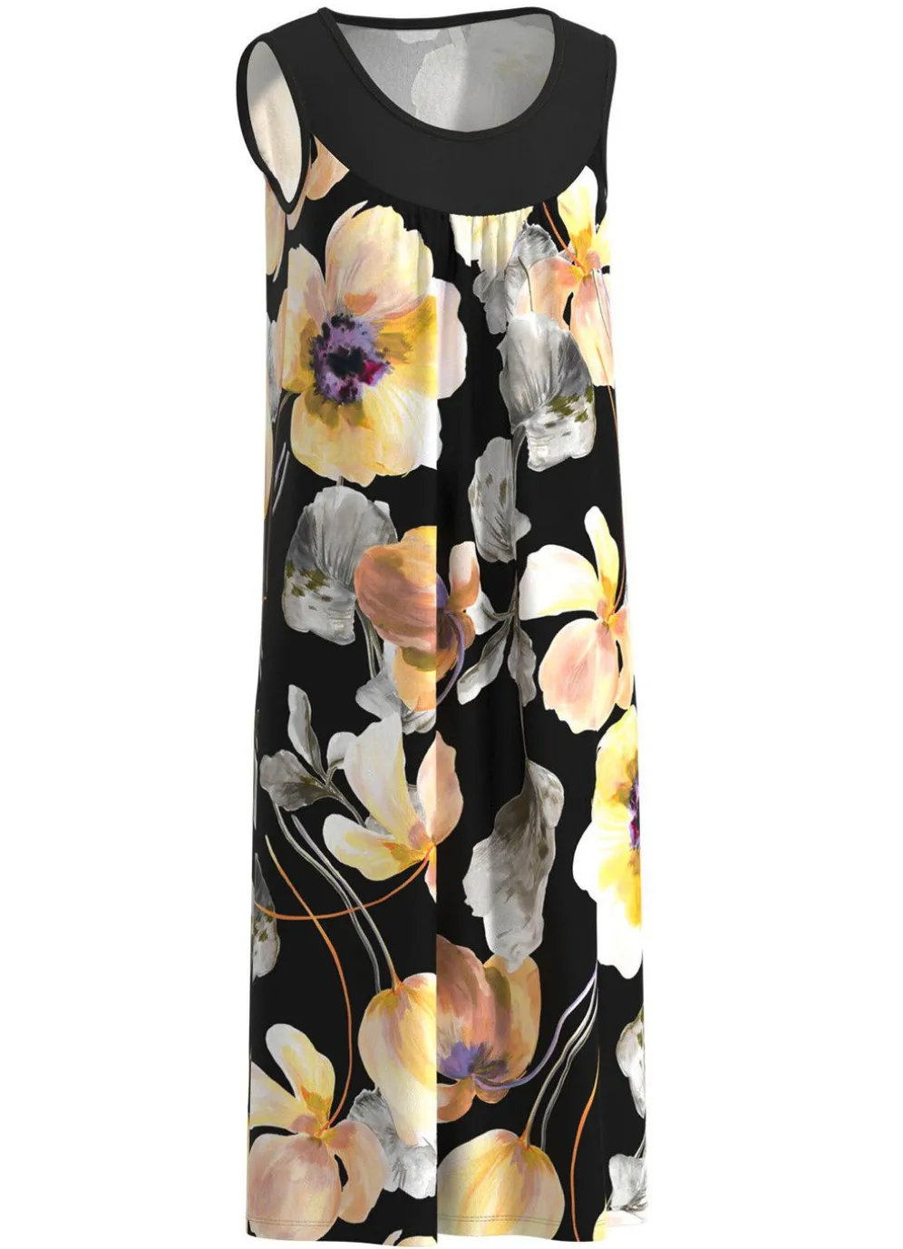 Jedes Teil ein Unikat! Ärmelloses Kleid mit farbbrillantem Druckdessin in Schwarz-Bunt allover sowie Raffungen unterhalb der schwarzen Ausschnittblende. Länge ca. 112 cm.