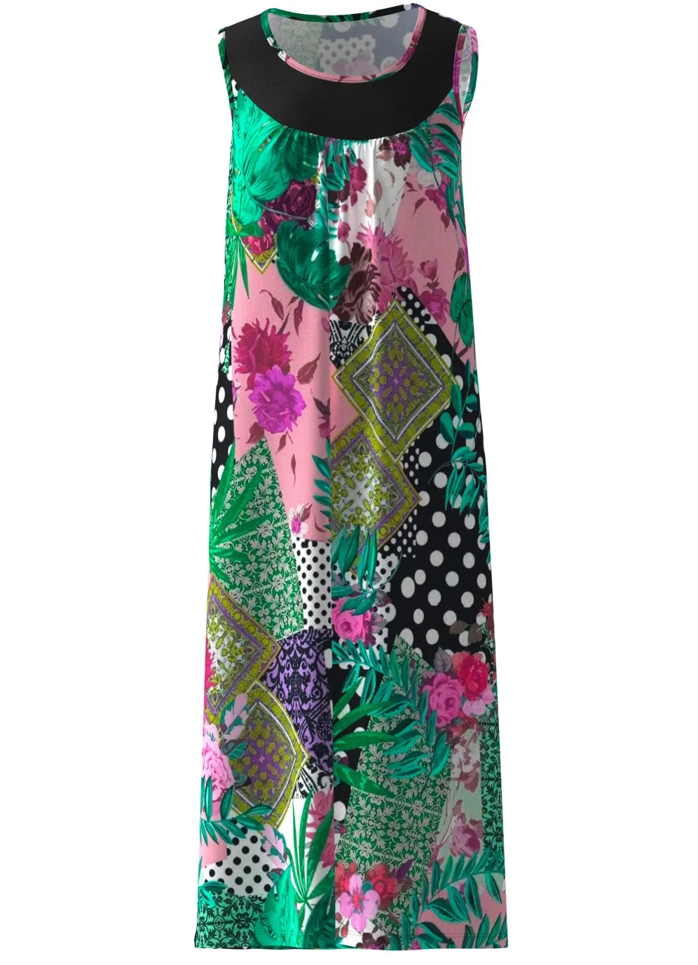 Jedes Teil ein Unikat! Ärmelloses Kleid mit farbbrillantem Druckdessin in Grün-Bunt allover sowie Raffungen unterhalb der schwarzen Ausschnittblende. Länge ca. 112 cm.