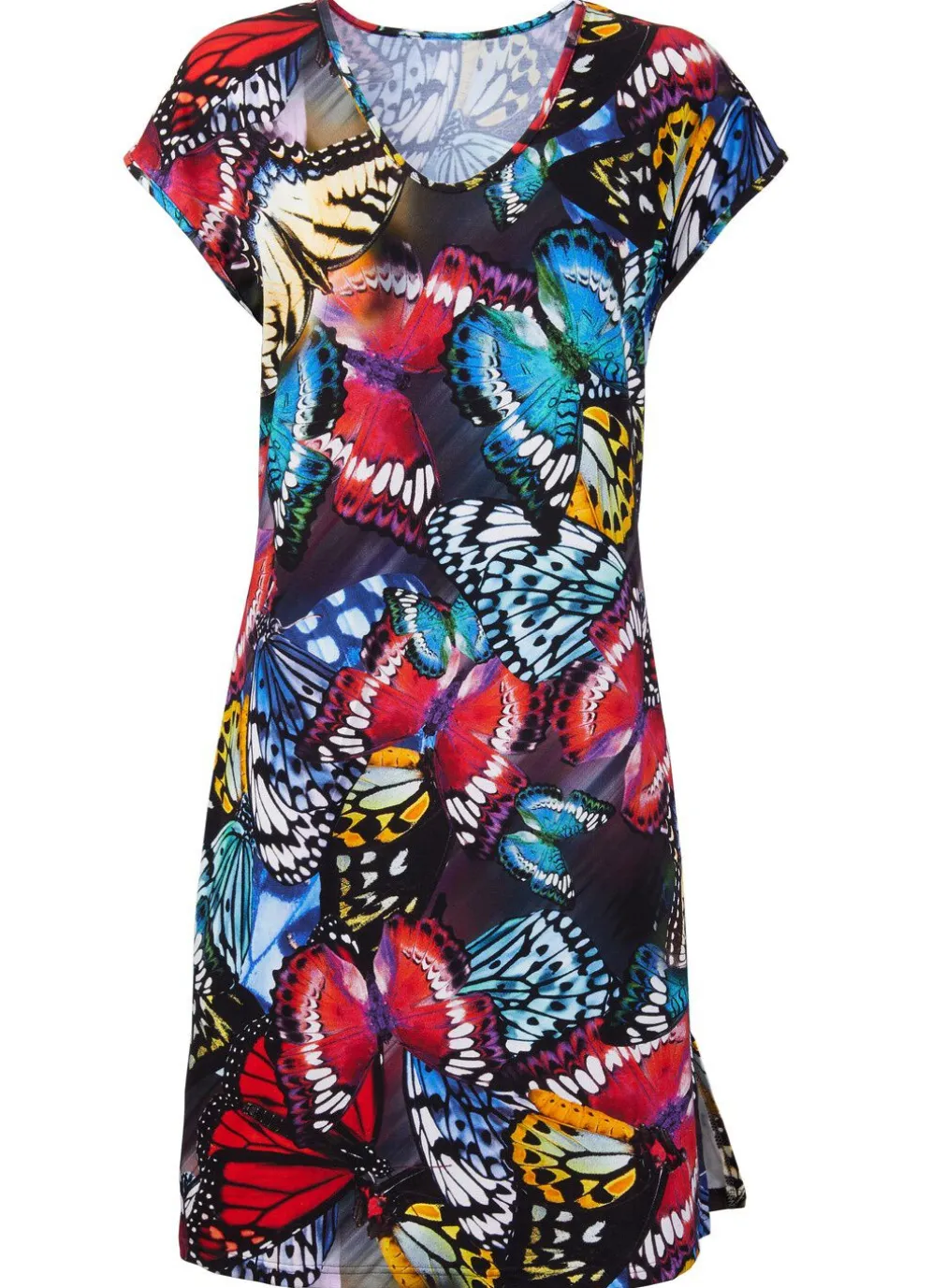 Hinreißendes Kleid mit hübschem Schmetterlings-Dessin in Schwarz-Bunt, überschnittenen Ärmeln, farbbrillantem Druck sowie einem Seitenschlitz. Länge ab 95 cm.