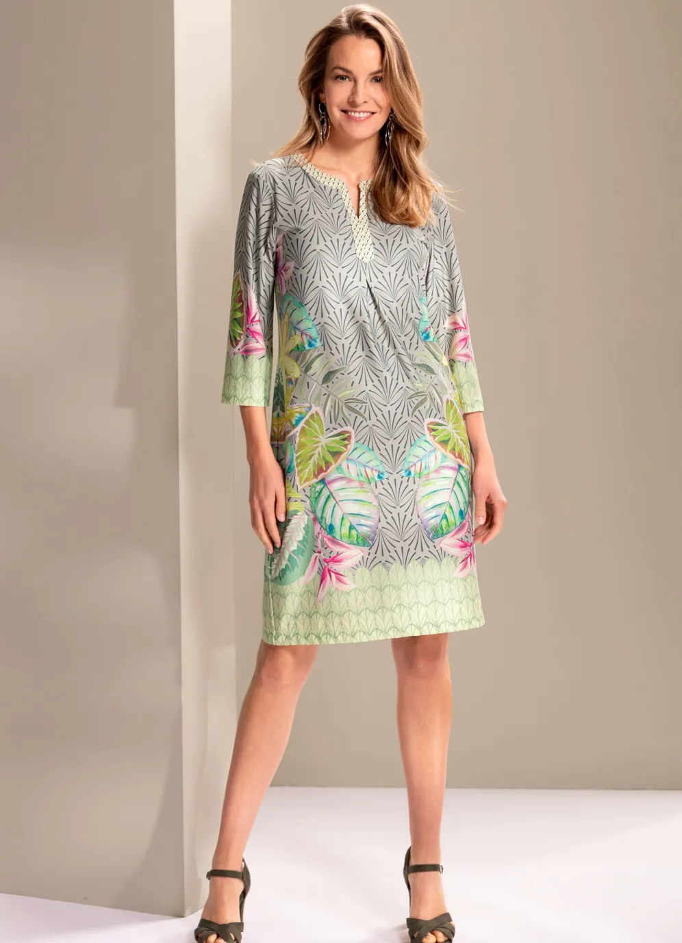Dieses Kleid in Schlupfform von B/ANCA in Khaki-Grün-Limone-Bunt ist feminin geschnitten, mit V-Ausschnitt am Stehkragen, 3/4-langen Ärmeln, Faltenlegung im Vorderteil sowie herrlicher Bordürendruck.