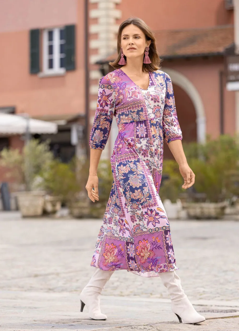 Ein Blickfang ist dieses bildschöne Kleid von B/ANCA: Schlupfform, V-Ausschnitt, Faltenlegung im Vorderteil, 3/4-lange Ärmel mit elastischen Abschlüssen sowie gekränkelter Saumabschluss.