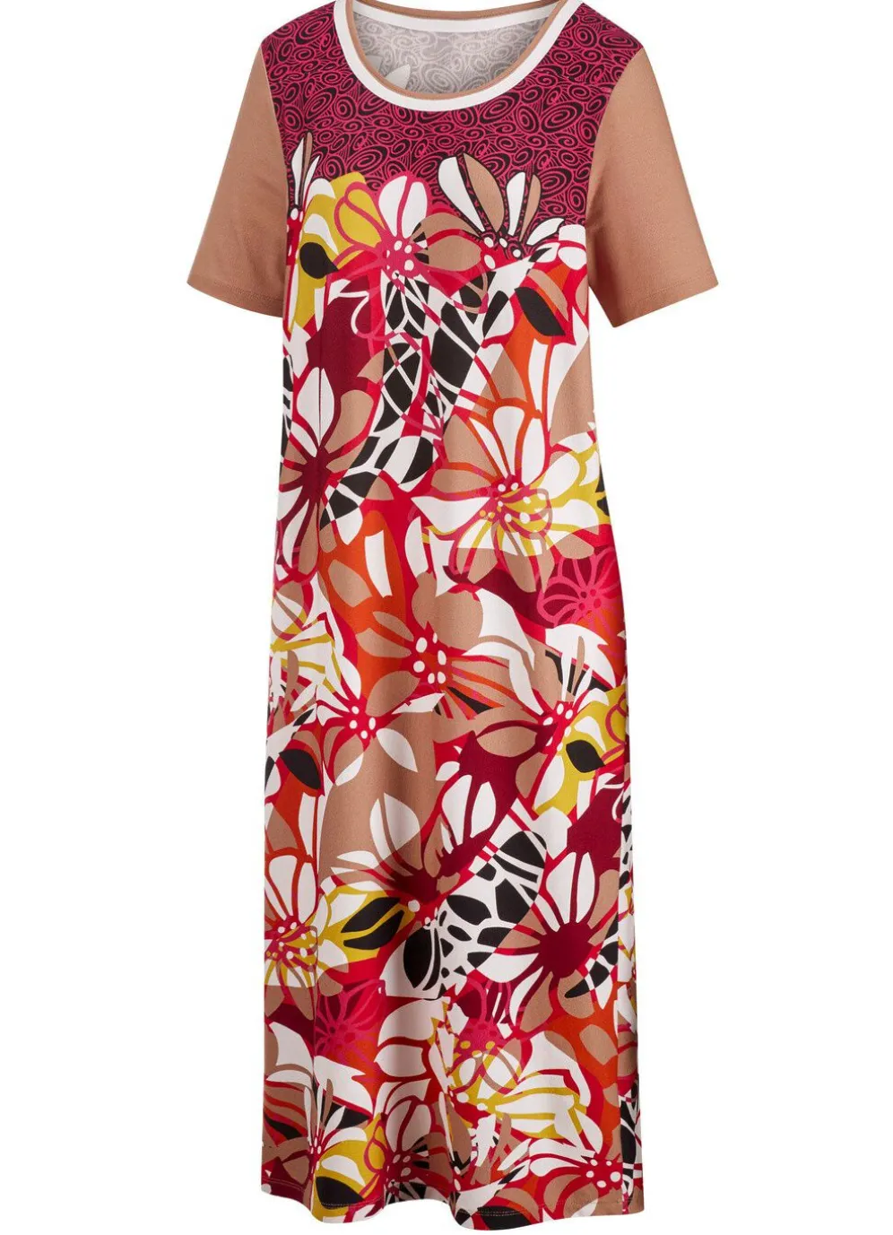 Knielanges „Laurina”-Nachthemd mit platziertem Bordürendruck in Sand-Pink-Bunt, mit