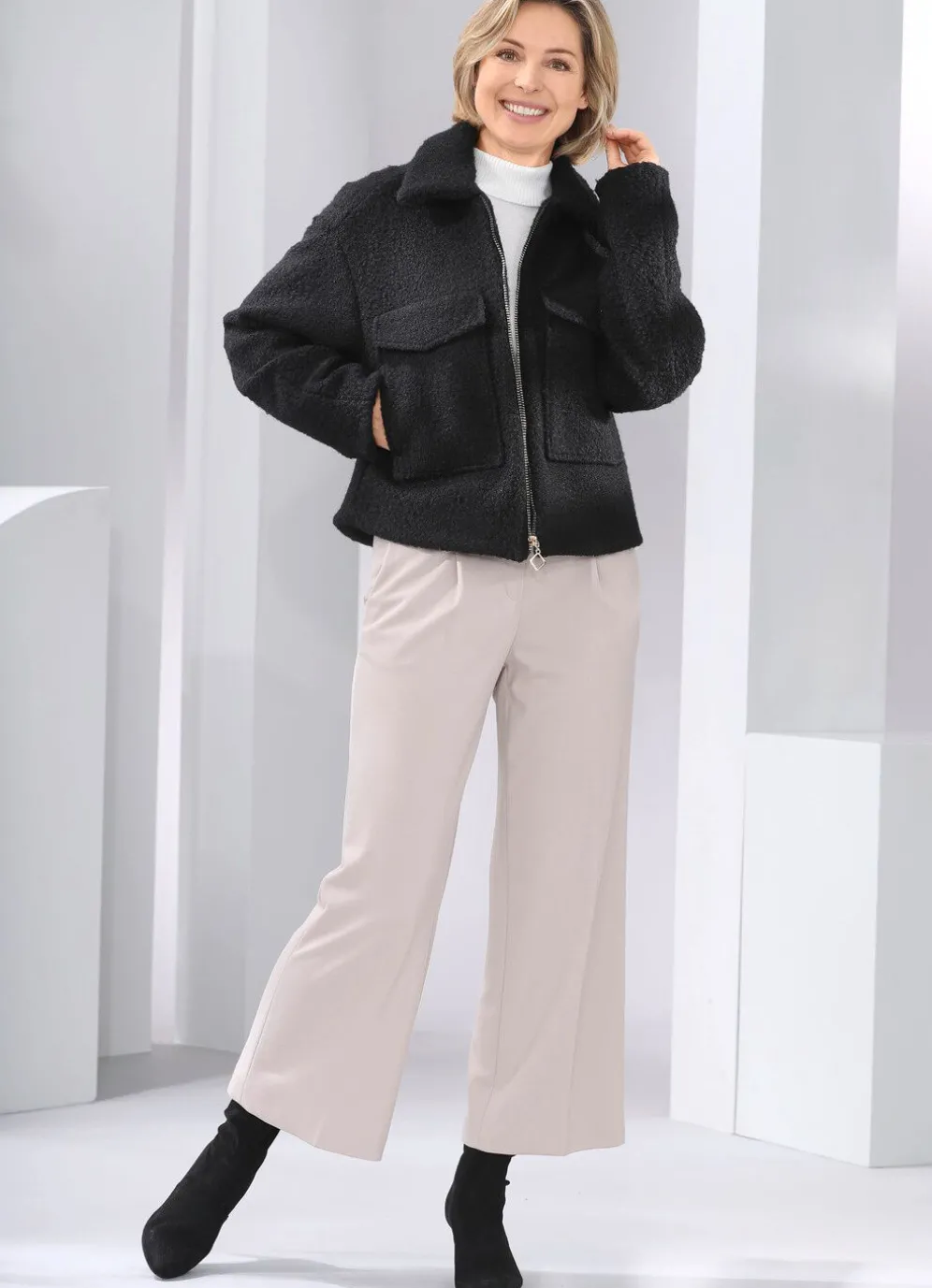 Fabelhafte, knöchellange Hose mit luftig weitem Bein: Schlupfform, glatt anliegend dank der innenliegenden Gummibund-Einlage, Reißverschluss-Zierblende, Seitentaschen sowie Bundfalten. Innenbeinlänge ca. 71 cm, Fußweite ab 58 cm.