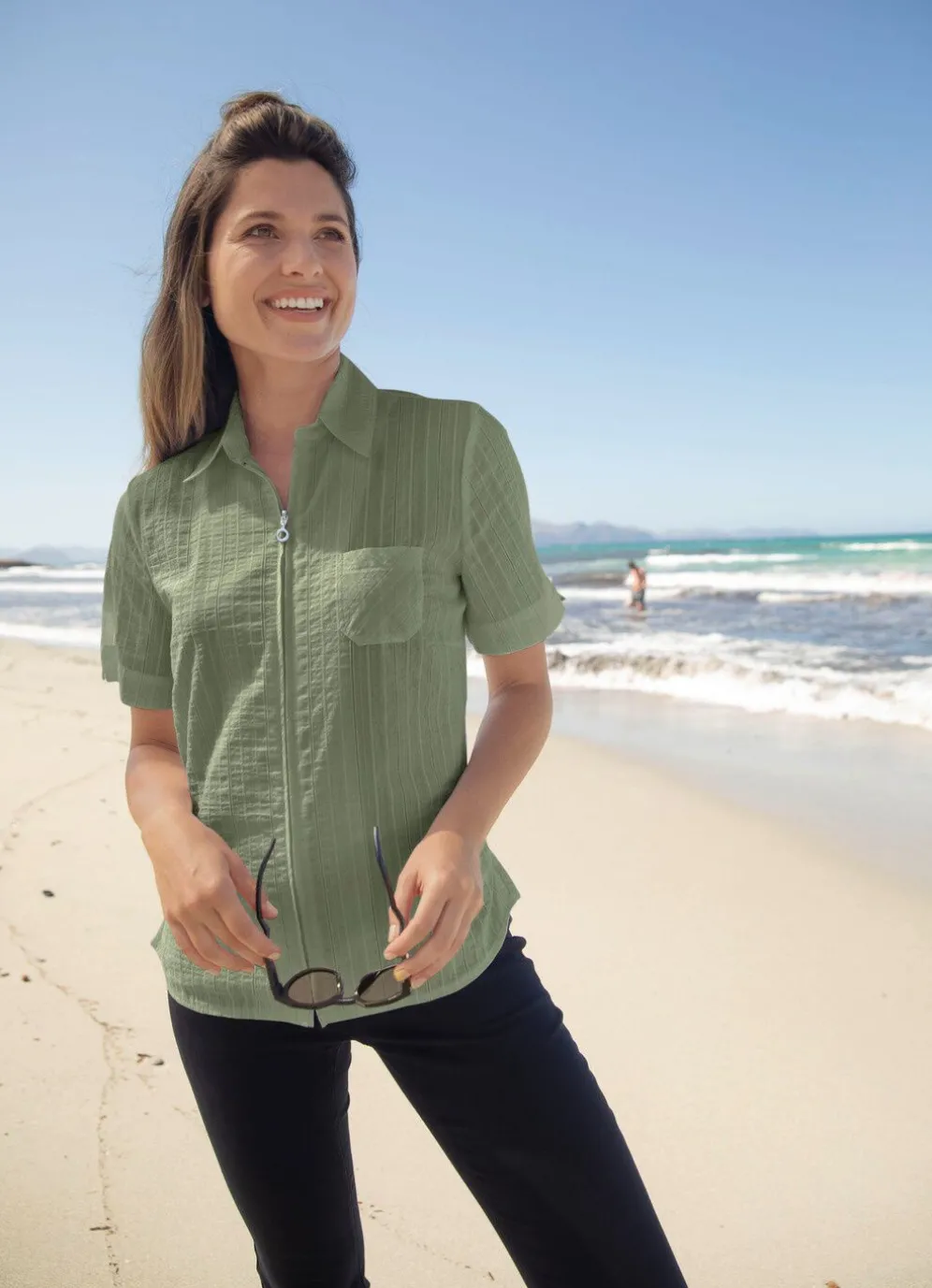 Kombistarke Blusenjacke mit Hemdkragen, Reißverschlussleiste, einer aufgesetzten Brusttasche, kurzen Ärmeln sowie Seitenschlitzen.