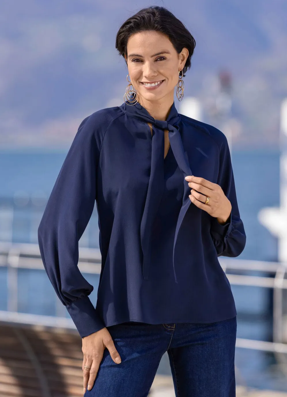 Kombistarke, marinefarbene Tunika von laurakent mit Bindeschluppe am V-Ausschnitt, lange Raglanärmel mit breiten Manschetten.