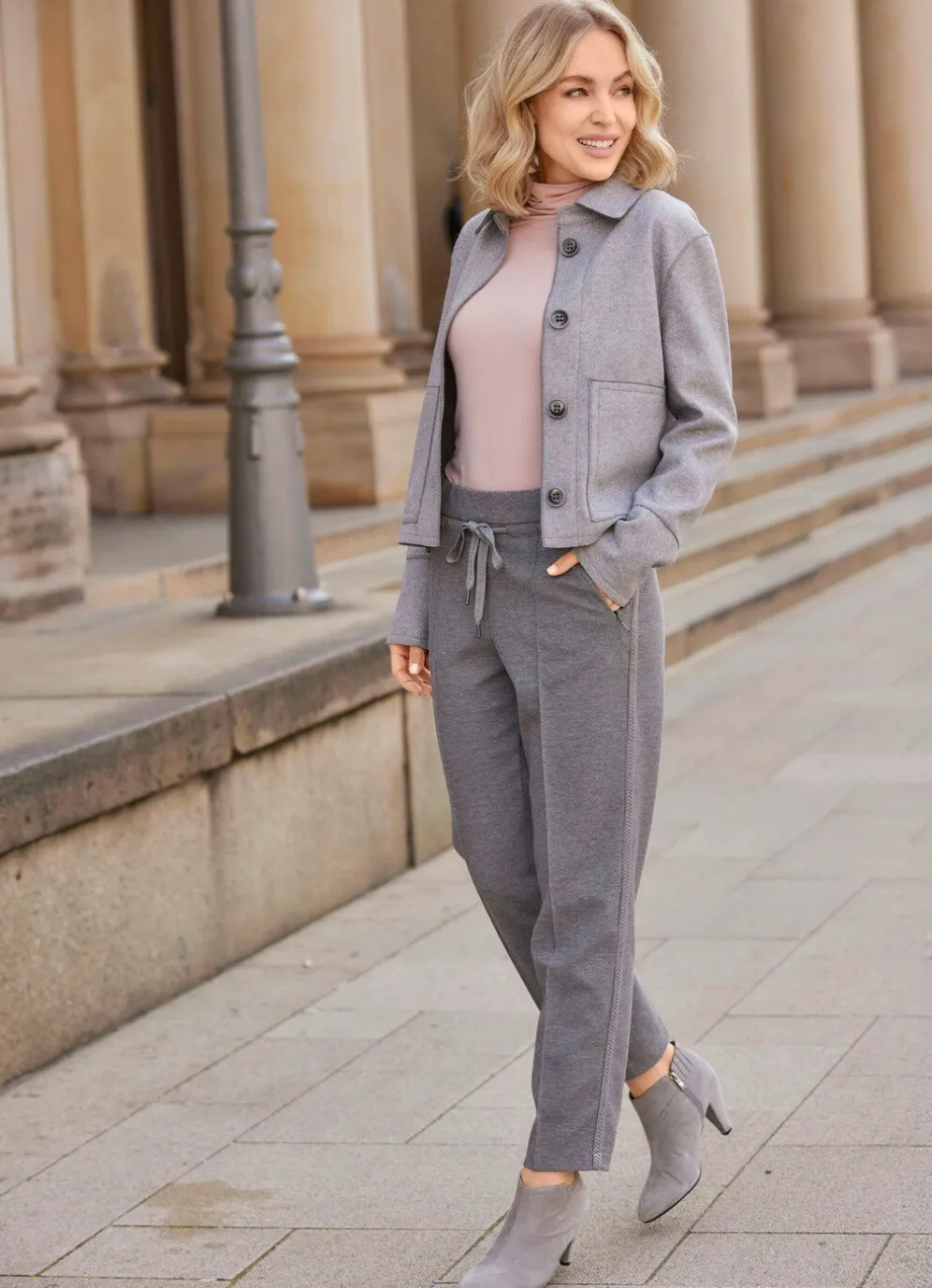 Von B/ANCA: grau melierte Kurzjacke mit Kragen, Knopfleiste und zwei Schubtaschen.