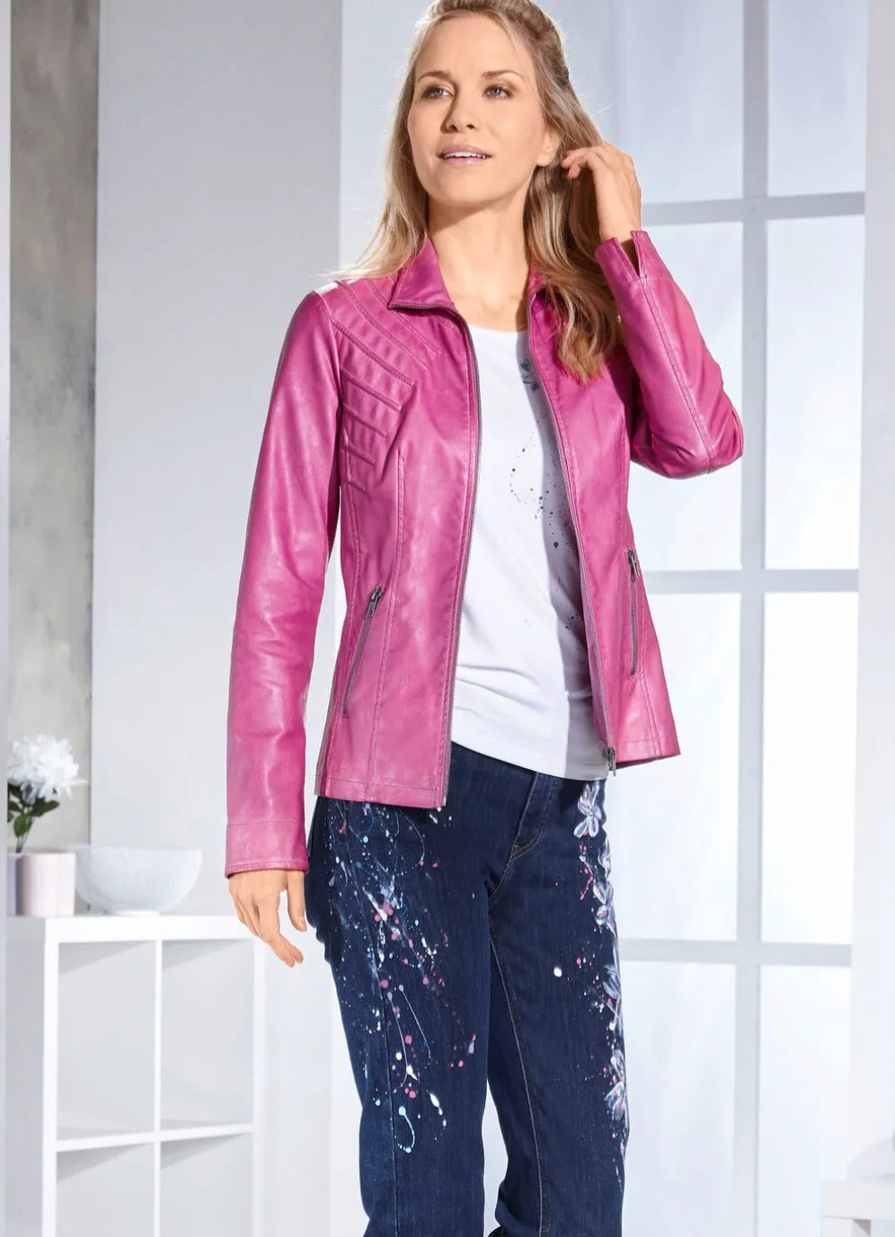 Ganz lässig zeigt sich diese azaleefarbene Kurzjacke mit Biesenzier im Vorder- und Rückteil, durch Reißverschluss hoch schließbarem Stehkragen, Reißverschlusstaschen sowie geschlitzten, umschlagbaren Ärmelabschlüssen. Länge ca. 60 cm, ab Gr. 40 ca. 63 cm, ab Gr. 46 ca. 66 cm.