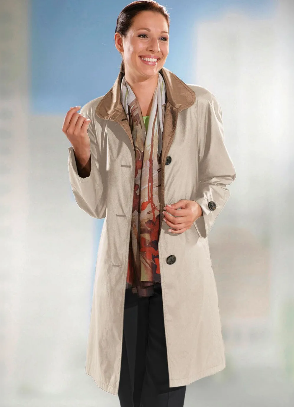 Geschmackvoller Kurzmantel in ausgestellter Form mit hohem Tragekomfort, Kontrastverarbeitung, Knopfleiste, Taschen mit Blende, Schlitz und Knopf an den Abschlüssen der umschlagbaren Halbraglanärmel, Seitenschlitzen mit Reißverschluss sowie einer Innentasche und einer Handy-Innentasche. Länge ca. 96 cm, ab Gr. 48 ca. 98 cm.