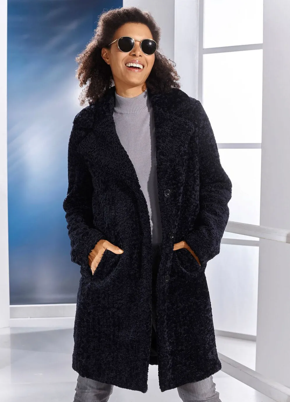 Nachtblauer Kurzmantel in edler Persianeroptik mit Reverskragen, Knopfleiste und Schubtaschen. Länge ca. 95 cm.