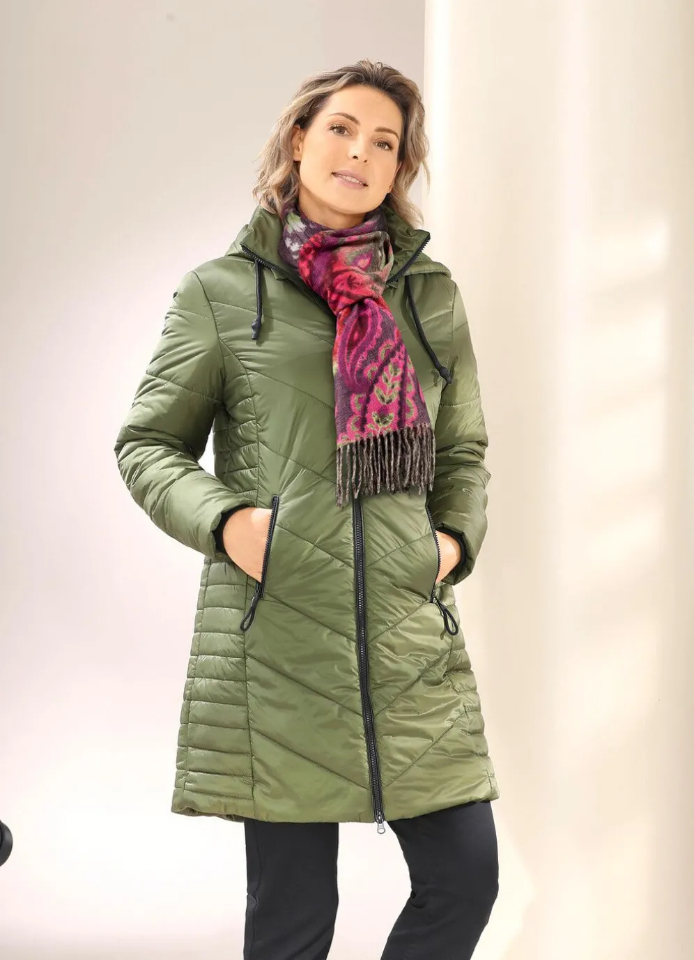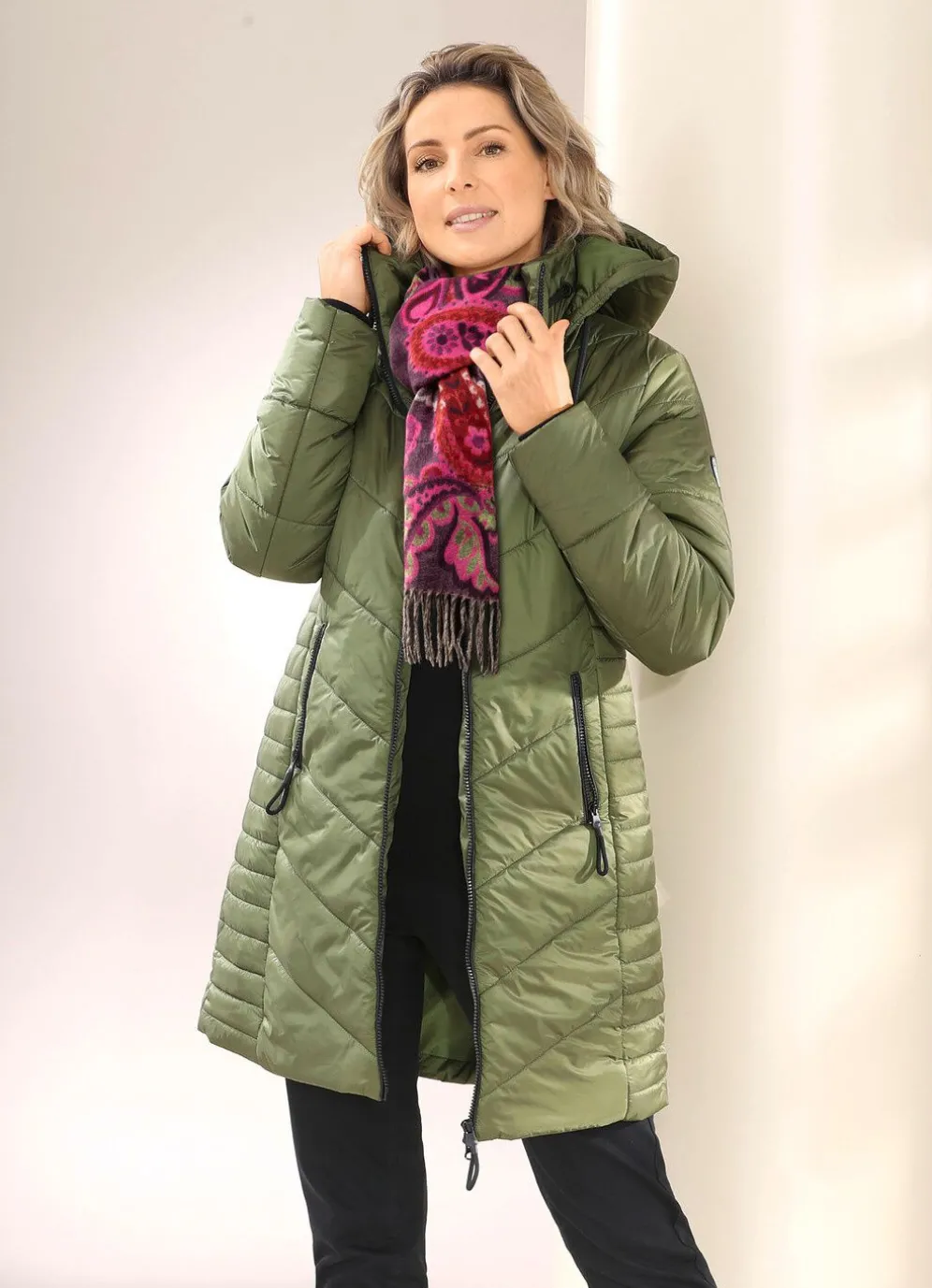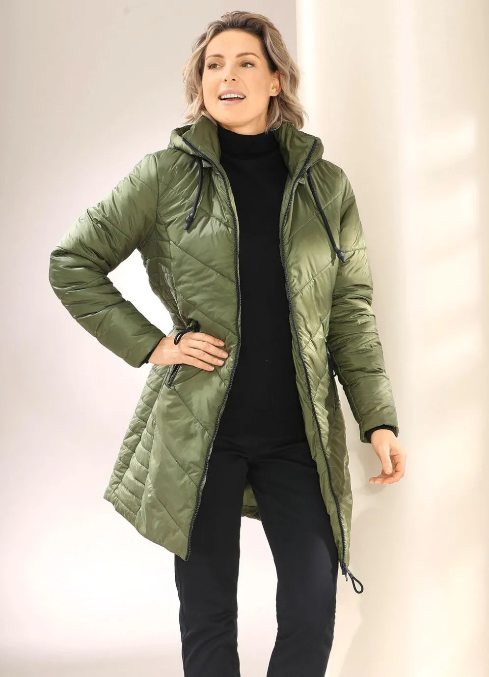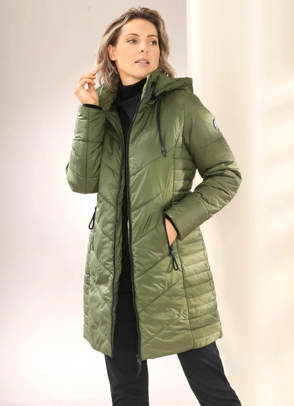 Kurzmantel mit Bindeband an der abnehmbaren Kapuze, durch 2-Wege-Reißverschluss hoch schließbarem Stehkragen mit Ösen und Zierkordel, Reißverschlusstaschen, Windfangärmeln aus Rippenstrick sowie einer Innentasche. Länge ca. 90 cm.