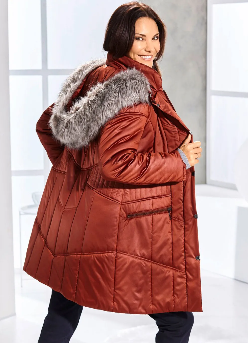 Perfekt für die kalte Jahreszeit ist dieser schöne Kurzmantel in Terra : abnehmbare Kapuze mit Riegel, Druckern und abnehmbarem Kunstpelz-Besatz, Stehkragen, Reißverschluss unter der Druckerleiste, Reißverschluss an den Taschen sowie eine Innentasche. Länge ca. 90 cm.