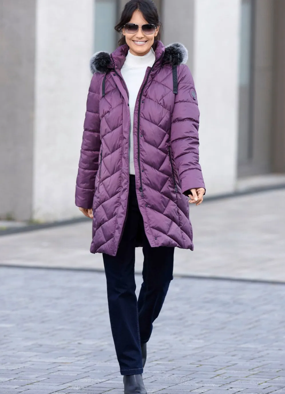 Geschmackvoller Kurzmantel mit Durchzugsband, Stopper und abnehmbarem Kunstpelz-Besatz an der abnehmbaren Kapuze, hoch schließbarem Stehkragen, Reißverschluss unter der verdeckten Druckerleiste, Reißverschluss an den Taschen und Seitenschlitzen, umschlagbaren Ärmeln sowie einer Innentasche. Länge ca. 90 cm.