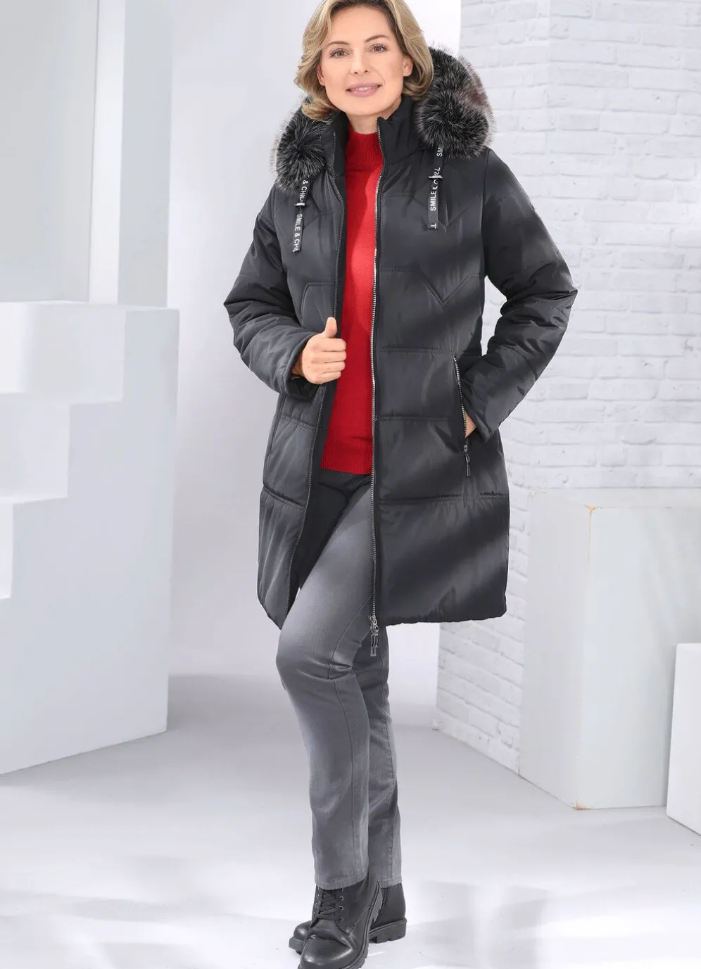 - abnehmbare Kapuze mit abnehmbarem Kunstpelz-Besatz