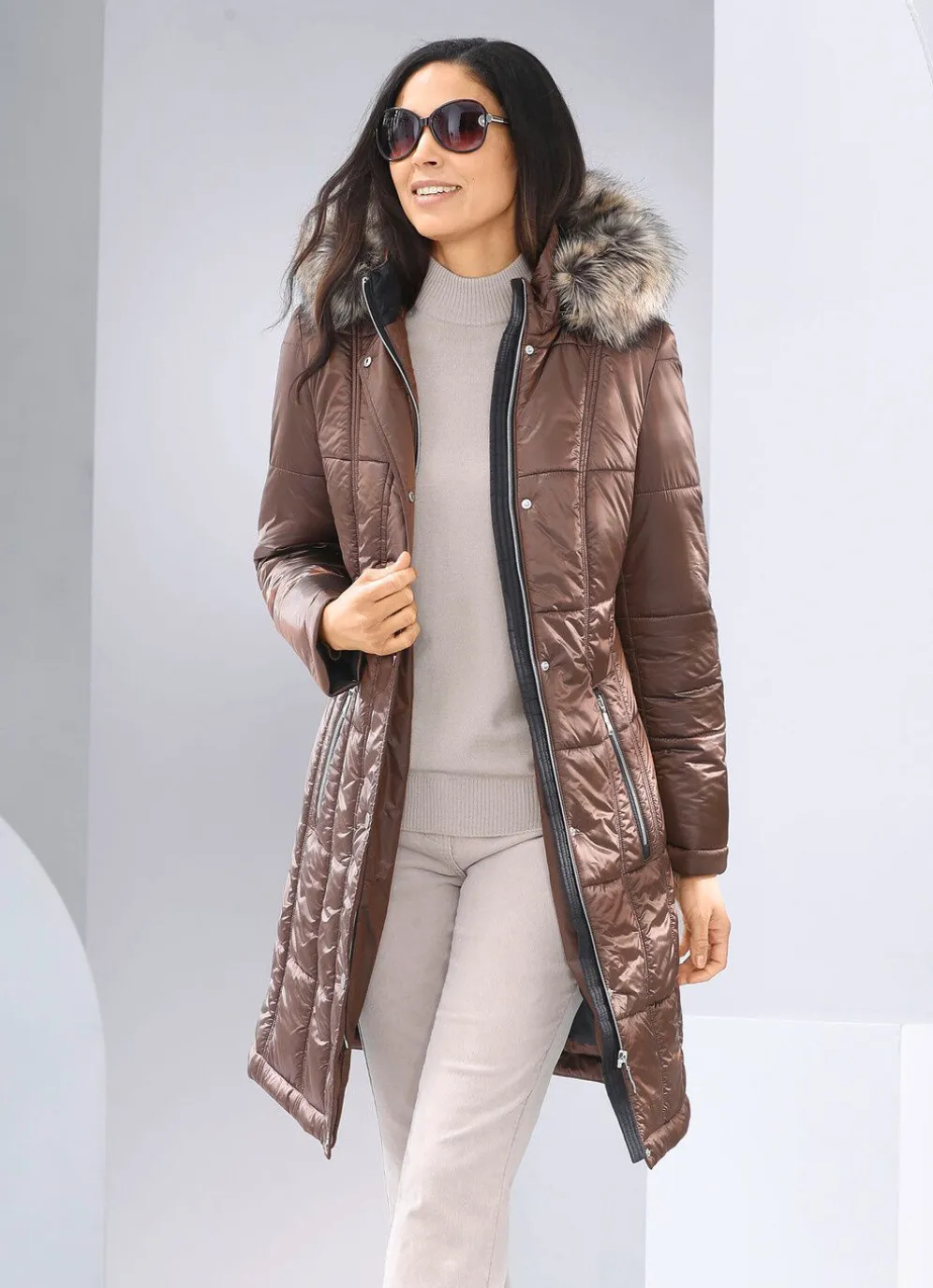 Für echtes Modevergnügen steht dieser nugatfarbene Kurzmantel: abnehmbare Kapuze mit Durchzugsband, Stopper und abnehmbarem Kunstpelz-Besatz, durch Reißverschluss unter der Druckerleiste hoch schließbarer Stehkragen, Reißverschluss an den Paspeltaschen sowie eine Innentasche. Länge ca. 95 cm.