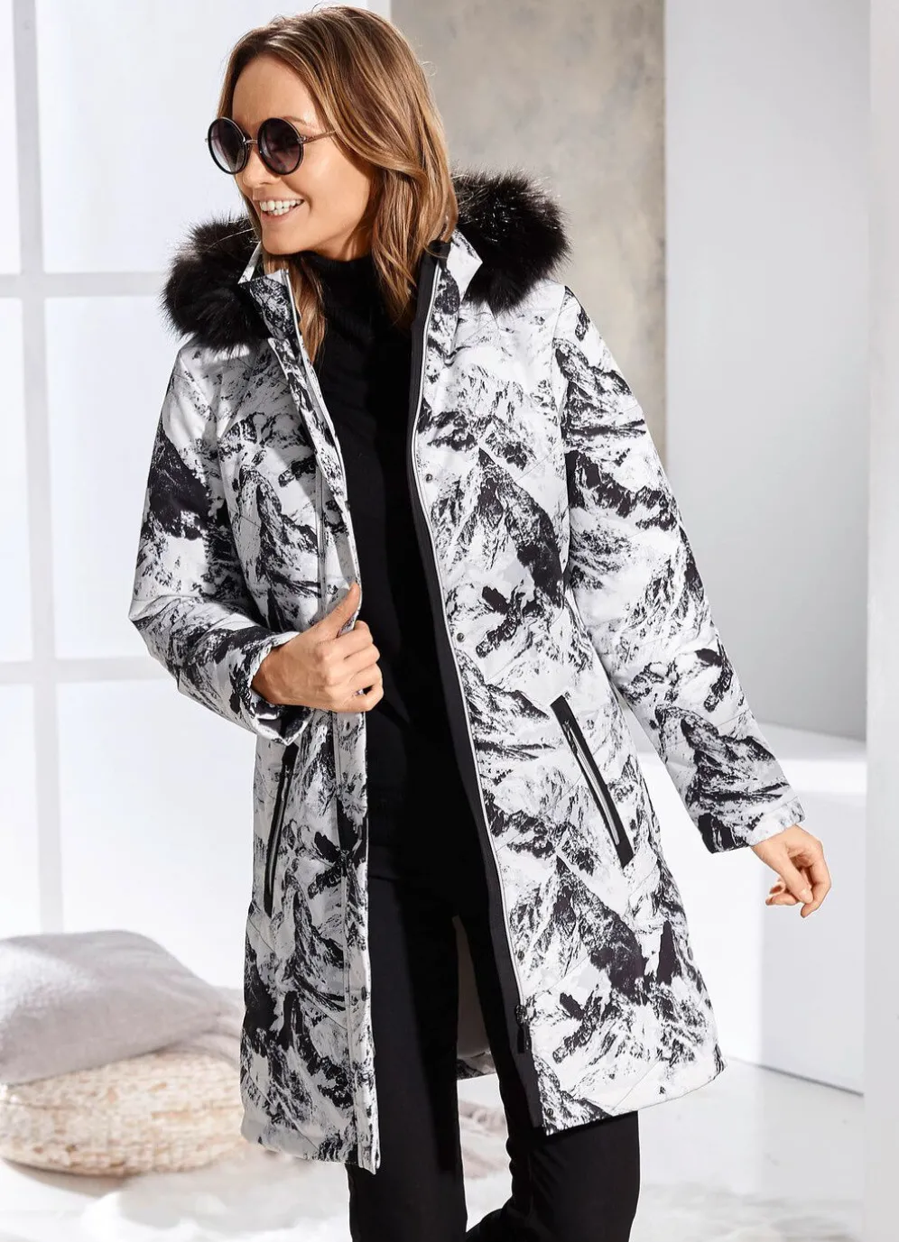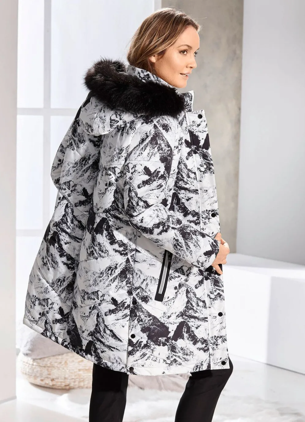 Kurzmantel in Weiß-Schwarz-Hellgrau: abnehmbare Kapuze mit Durchzugsband, Stopper und abnehmbarem Kunstpelz-Besatz, durch Reißverschluss unter der Druckerleiste hoch schließbarer Stehkragen, Reißverschlusstaschen, Seitenschlitze mit Druckern, umschlagbare Ärmel sowie eine Innentasche. Länge ca. 92 cm.