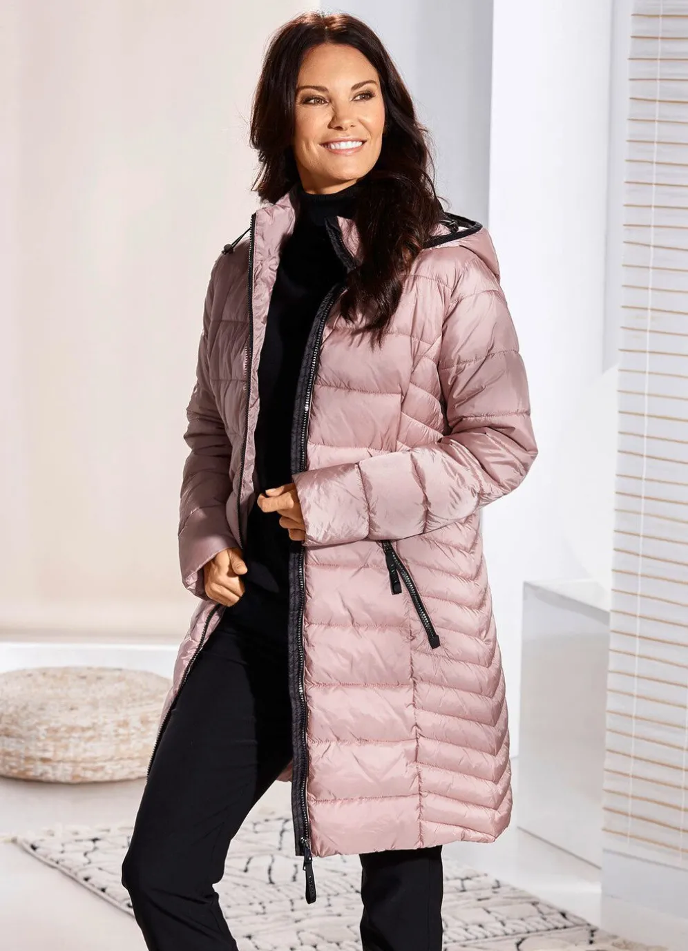 Mit diesem schicken Funktions-Kurzmantel in Rosenholz werden Sie alle Blicke auf sich ziehen. Er überzeugt mit Durchzugsband und Stopper an der abnehmbaren Kapuze, durch 2-Wege-Reißverschluss hoch schließbarem Stehkragen, Reißverschlusstaschen, umschlagbaren Ärmeln sowie einer Innentasche. Länge ca. 90 cm.