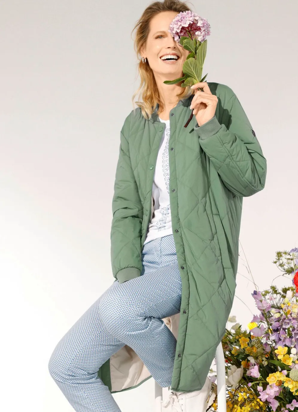 Leicht taillierter Kurzmantel mit rundem Halsausschnitt, Druckerleiste, Rippbündchen an den langen Ärmeln, Schubtaschen sowie komfortablen Druckern an den Seitenschlitzen. Länge ca. 106 cm.