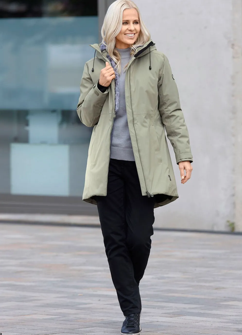 Hervorragender Kurzmantel mit Durchzugsband, Regenschild und Kunstpelz-Innenausstattung in der angeschnittenen Kapuze, hoch schließbarem Stehkragen, 2-Wege-Reißverschluss, verdeckten Reißverschlusstaschen, weitenreguliererbarem Riegel mit Klett an den Ärmelabschlüssen, einer Innentasche sowie Schlitz mit Riegel und Drucker im leicht verlängerten, abgerundeteten Rückteil. Länge ca. 93 cm, ab Gr. 42 ca. 96 cm, ab Gr. 50 ca. 99 cm.