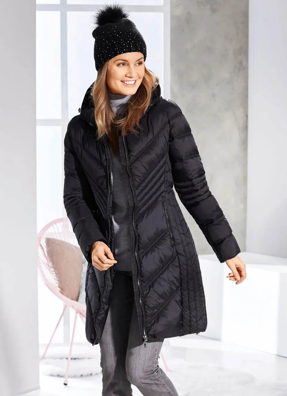 Schwarzer Kurzmantel mit seitlich figurgünstiger Längssteppung: feste Kapuze mit Durchzugsband und Stopper, Reißverschlussleiste, Taschen mit Reißverschluss sowie Windfangärmel aus Rippenstrick. Länge ca. 90 cm.