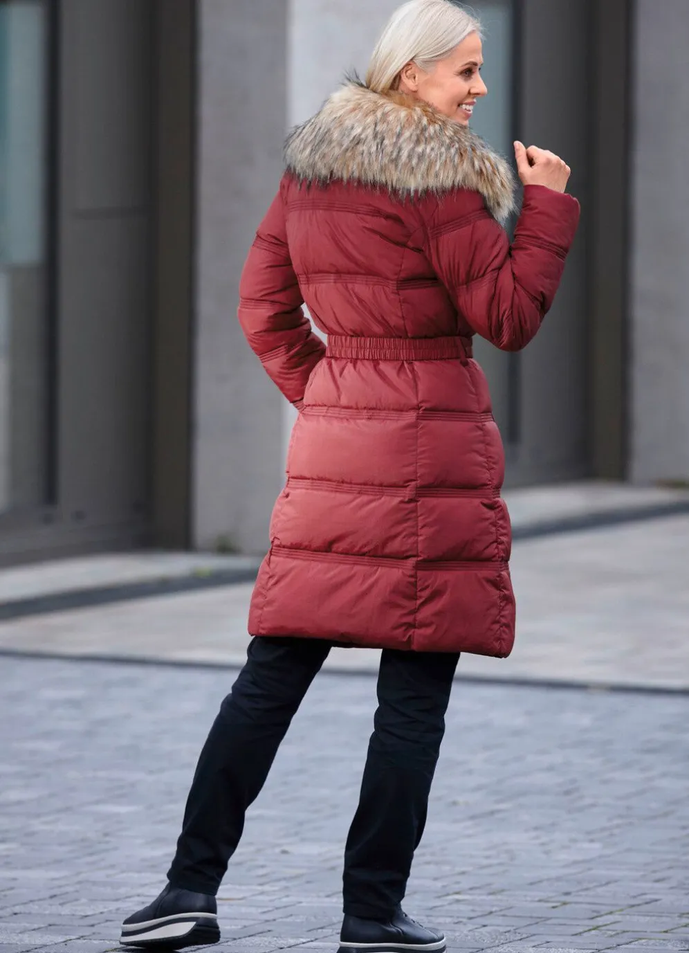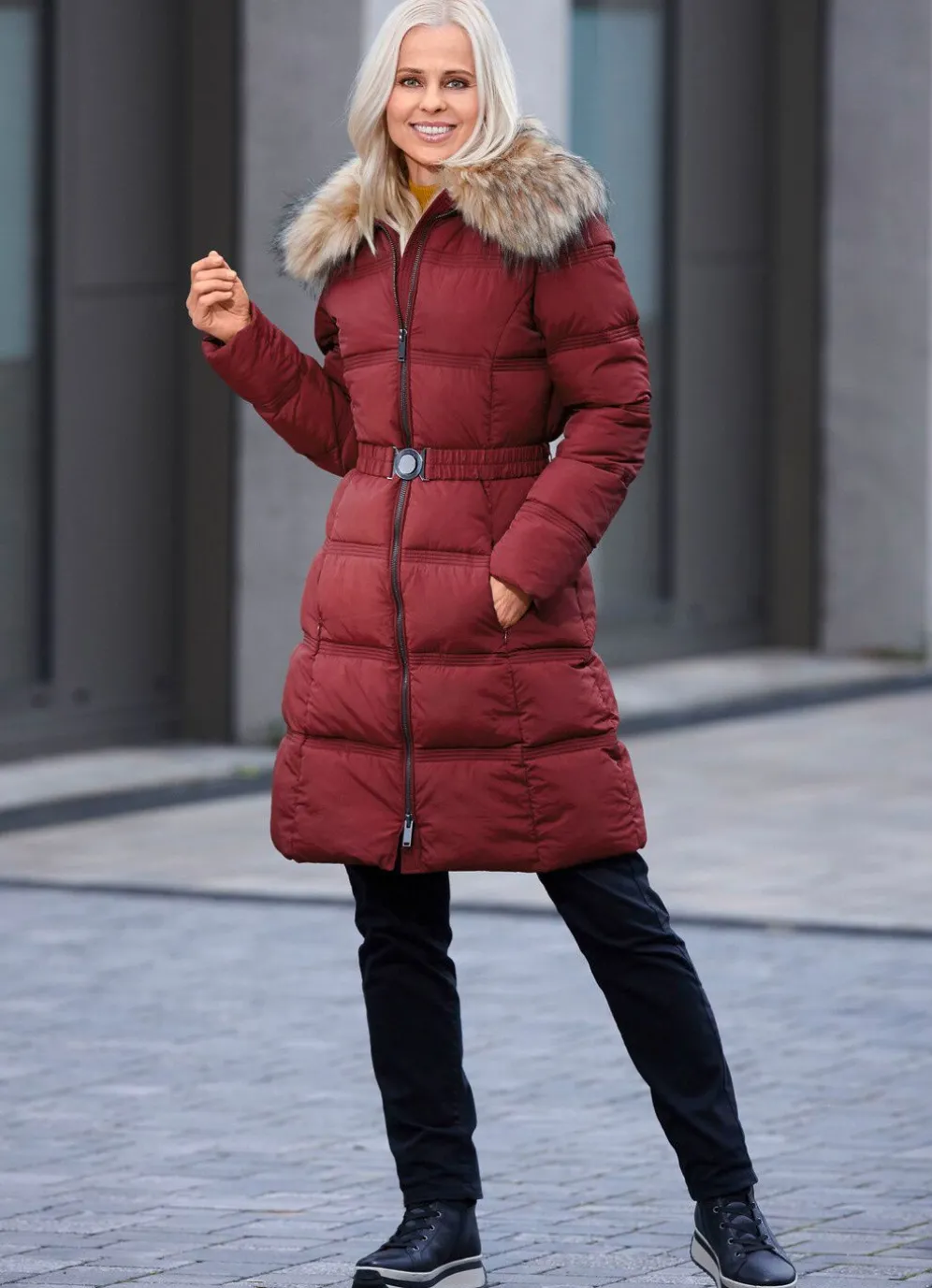 Umwerfender Kurzmantel: durch 2-Wege-Reißverschluss hoch schließbarer Kragen mit abnehmbarem Kunstpelz-Besatz, Gürtelschlaufen, Gürtel sowie nahtfeine Reißverschlusstaschen. Länge ca. 98 cm.