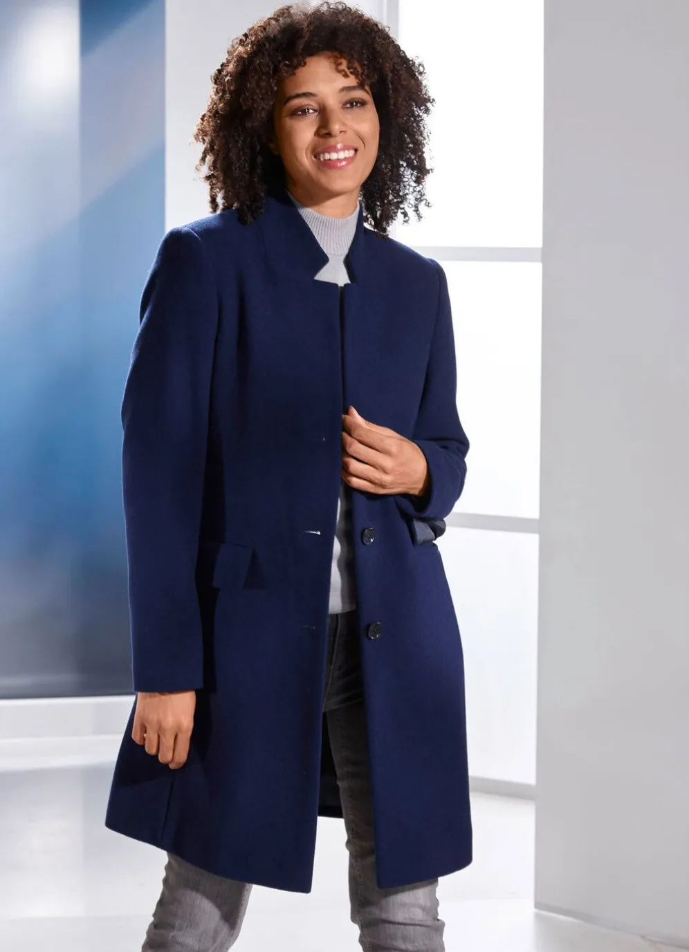 Kurzmantel mit Kelchkragen, Knopfleiste sowie Pattentaschen. Länge ca. 92 cm.