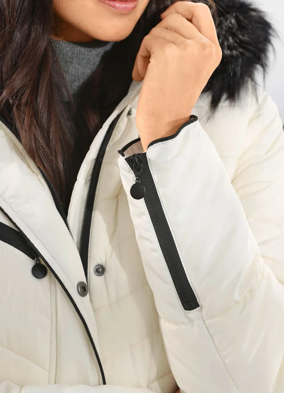 Freuen Sie sich auf die kalte Jahreszeit! – Mit diesem kuscheligen, naturfarbenen Kurzmantel: abnehmbare Kapuze mit abnehmbarem Kunstpelz- Besatz und Kunstpelz-Innenausstattung, durch Reißverschluss unter der Druckerleiste hoch schließbarer Stehkragen, Reißverschlusstaschen, Reißverschluss an den Ärmelabschlüssen, eine Innentasche sowie Zier-Reißverschluss auf den Ärmeln und im Rückteil. Länge ca. 88 cm.