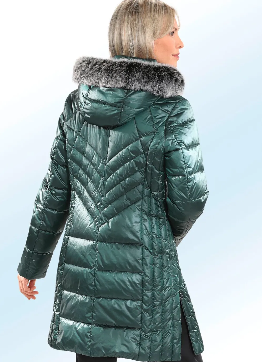 Besonders bequem zu tragen ist dieser flotte Kurzmantel mit seitlich figurfreundlicher Längssteppung, Durchzugsband, Stopper und abnehmbarem Kunstpelz-Besatz an der abnehmbaren Kapuze, durch Reißverschluss hoch schließbarem Stehkragen, Reißverschluss an Paspeltaschen und Seitenschlitzen, umschlagbaren Ärmeln sowie einer Innentasche. Länge ca. 88 cm.