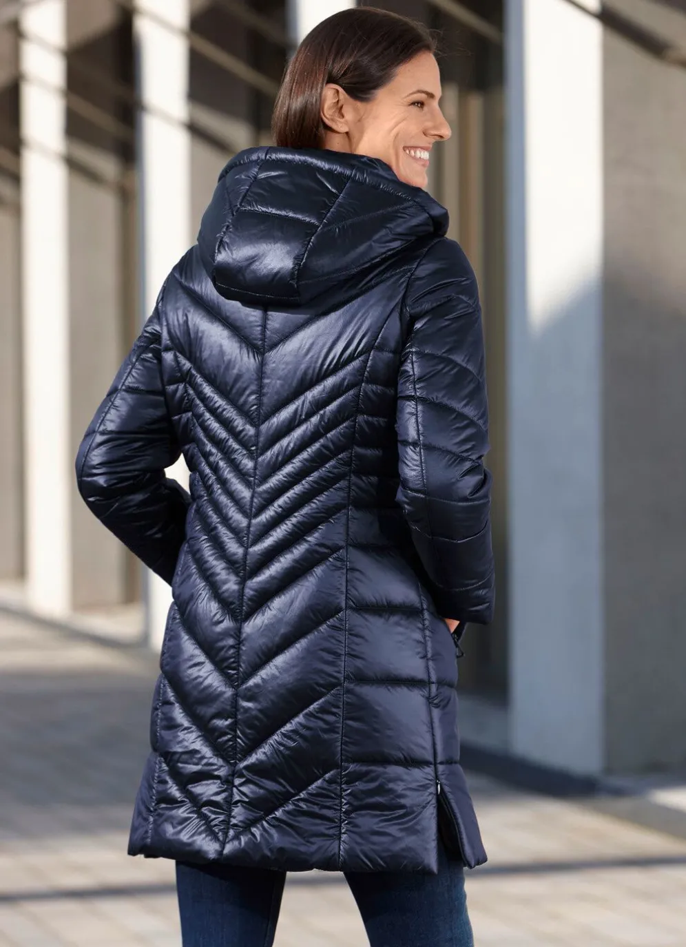 Superschick präsentiert sich dieser Kurzmantel: abnehmbare Kapuze mit Durchzugsband und Stopper, durch Reißverschluss unter der Druckerleiste hoch schließbarer Stehkragen, verdeckte Reißverschlusstaschen, Seitenschlitze mit Reißverschluss, umschlagbare Ärmel sowie eine Innentasche. Länge ca. 90 cm.