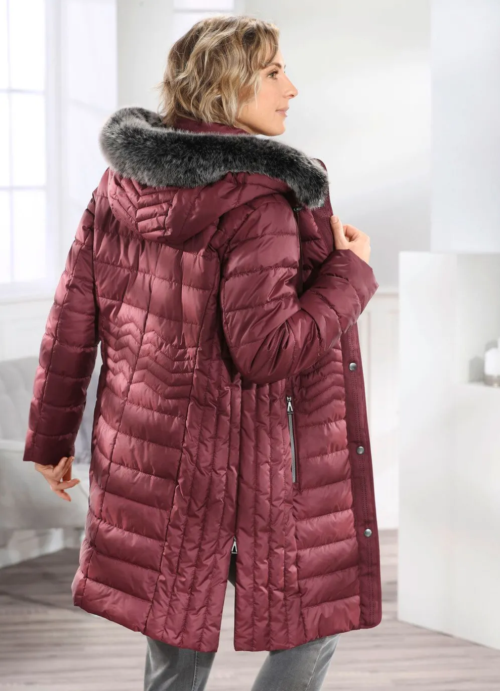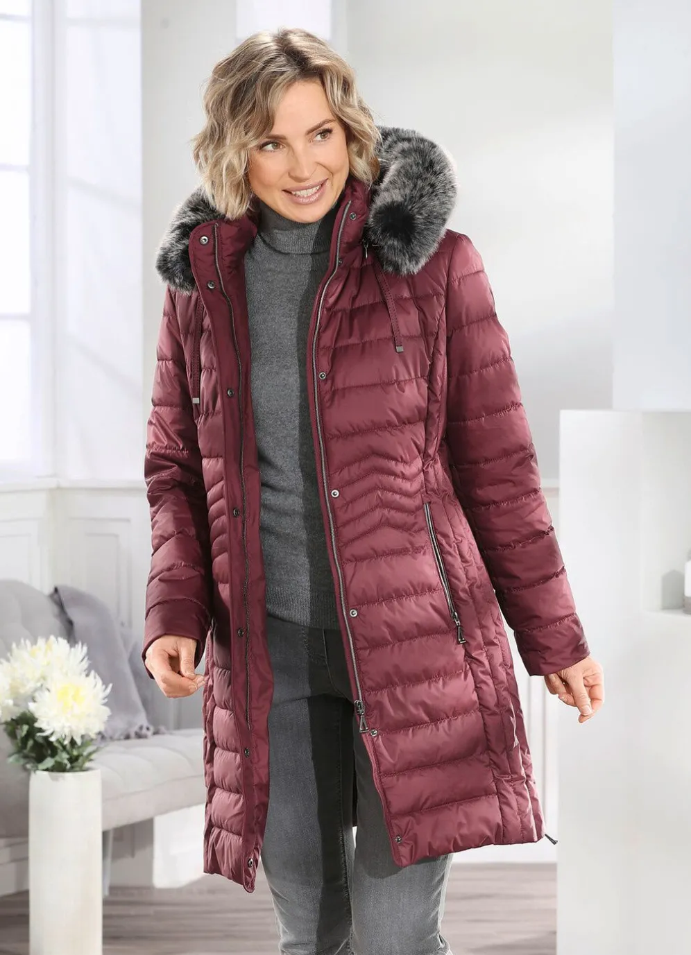 Kurzmantel mit figurschmeichelnder Längssteppung seitlich: abnehmbare Kapuze mit Durchzugsband, Stopper, Flanell-Innenausstattung und abnehmbarem Kunstpelz-Besatz, durch Reißverschluss unter der Druckerleiste hoch schließbarer Stehkragen, Reißverschluss an Taschen und Seitenschlitzen, umschlagbare Ärmel sowie eine Innentasche. Länge ca. 88 cm.