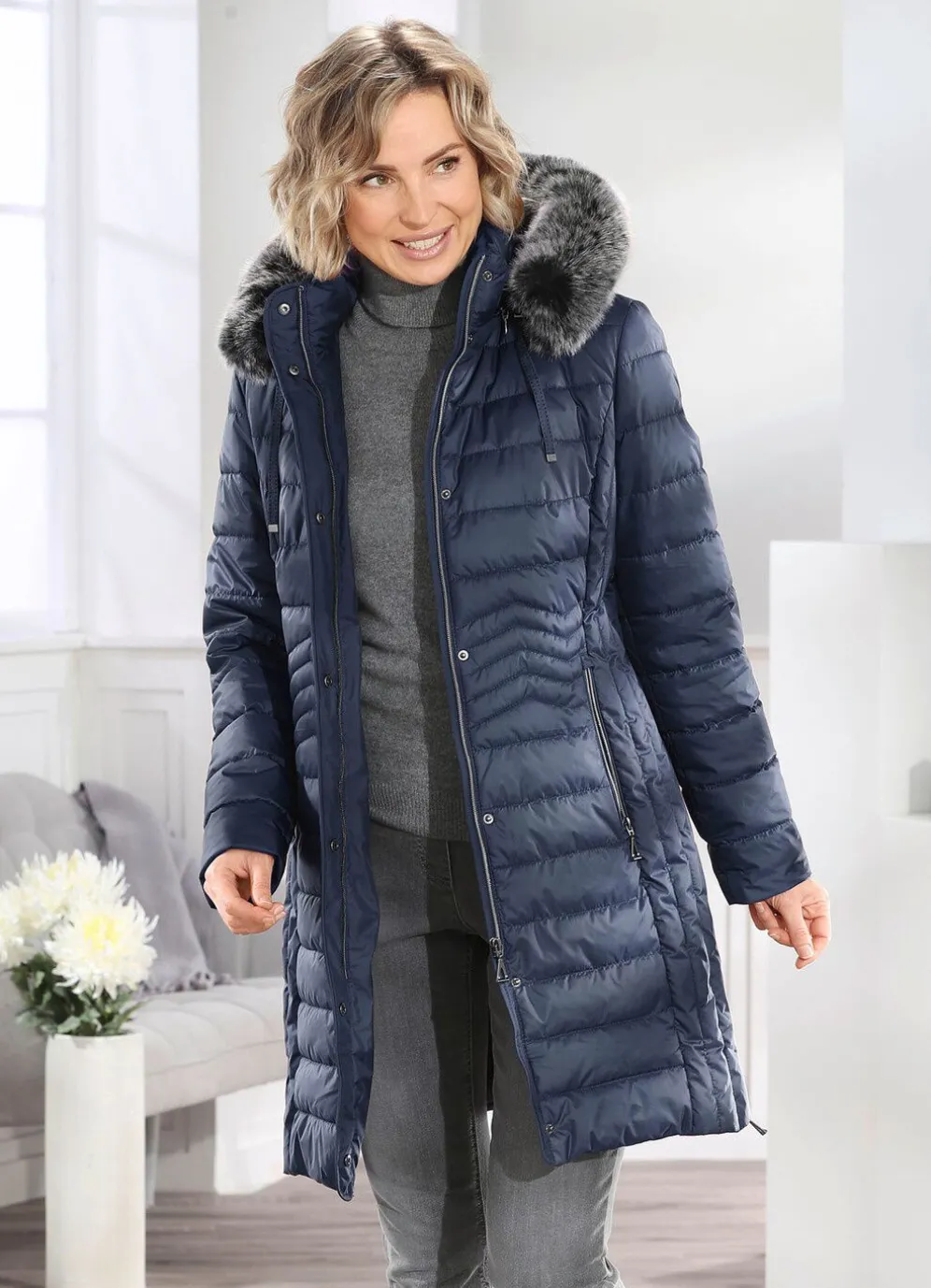 Kurzmantel mit figurschmeichelnder Längssteppung seitlich: abnehmbare Kapuze mit Durchzugsband, Stopper, Flanell-Innenausstattung und abnehmbarem Kunstpelz-Besatz, durch Reißverschluss unter der Druckerleiste hoch schließbarer Stehkragen, Reißverschluss an Taschen und Seitenschlitzen, umschlagbare Ärmel sowie eine Innentasche. Länge ca. 88 cm.