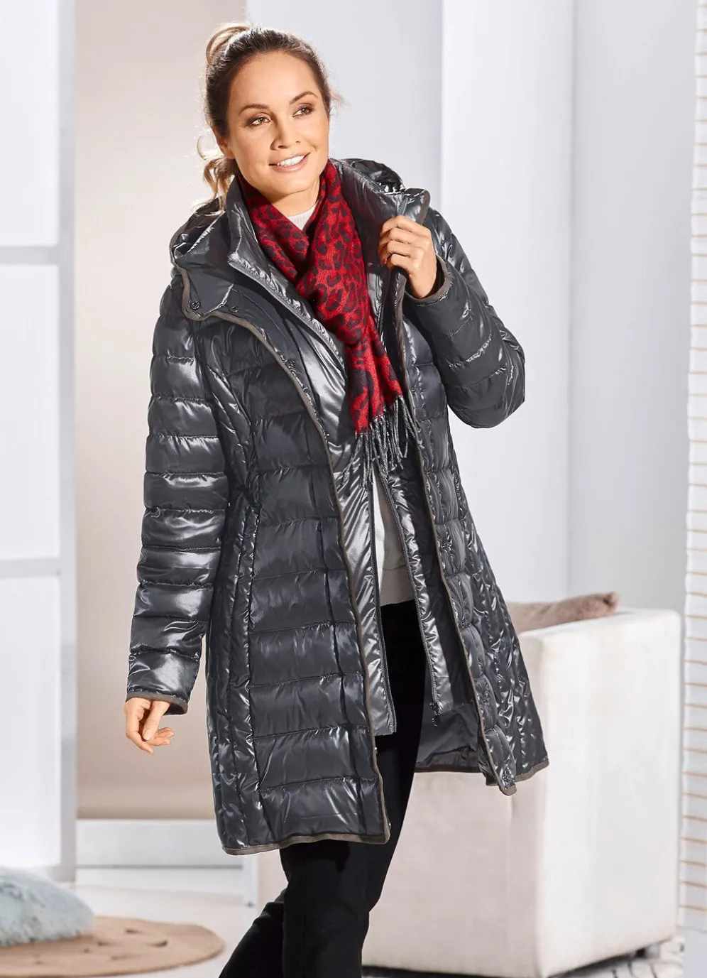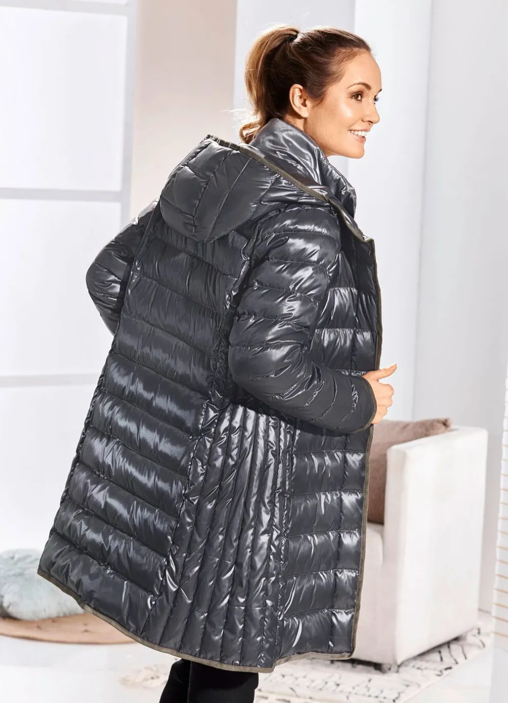 Für Ihren glanzvollen Auftritt! Kurzmantel in Grafit, mit figurschmeichelnder, seitlicher Längssteppung: feste Kapuze mit Durchzugsband und Stopper, durch Reißverschluss hoch schließbarer Stehkragen am festen Westeneinsatz, verdeckte Druckerleiste sowie nahtfeine Reißverschlusstaschen. Länge ca. 92 cm.
