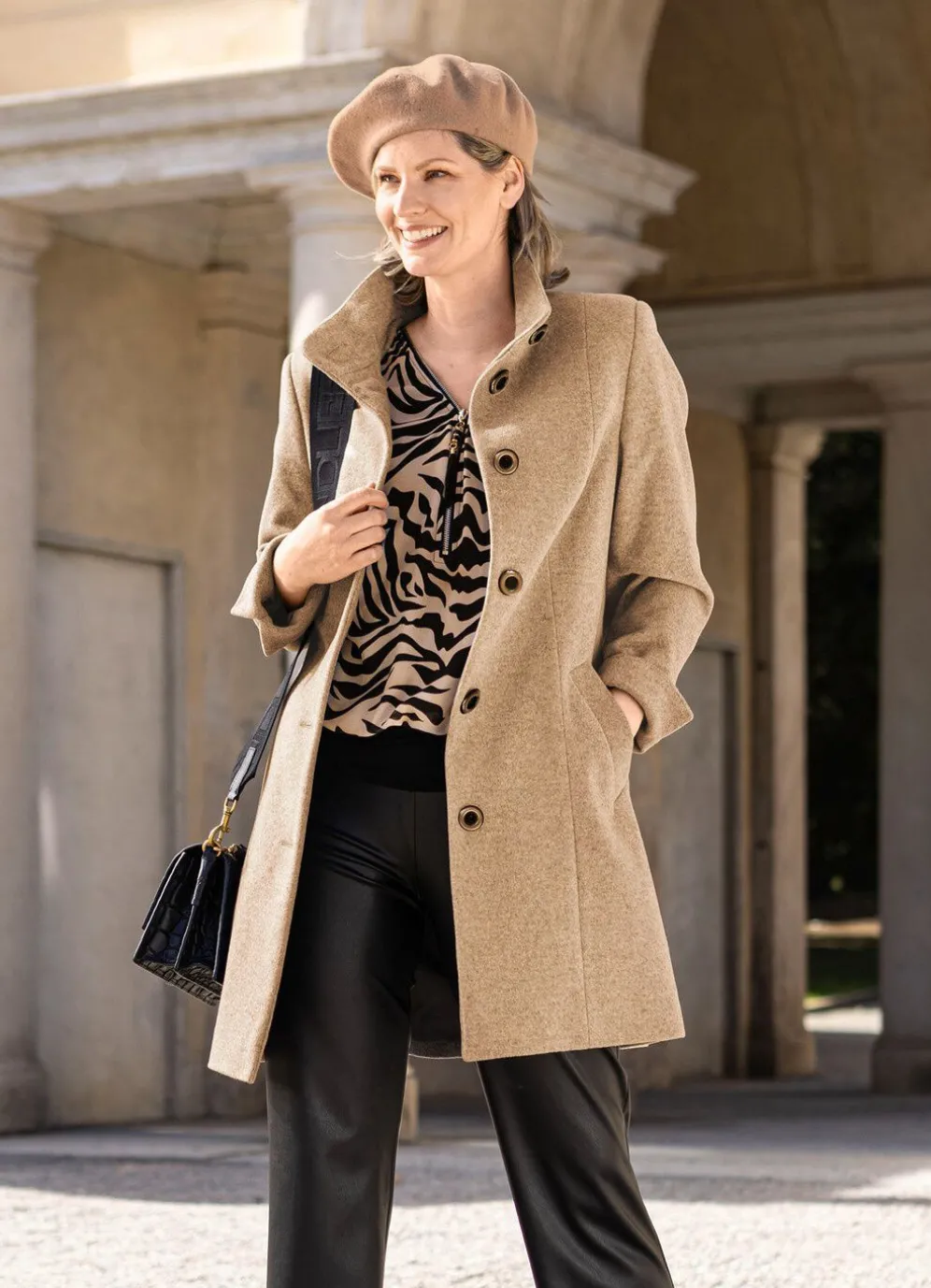Ein lässig eleganter Look für Business & Co. Der trendstarke, camelfarbene Kurzmantel zeigt sich mit Stehkragen, Knopfleiste, breiten Blenden an den Schubtaschen, geschlitzten Ärmelabschlüssen sowie einer Innentasche. Länge ca. 90 cm.