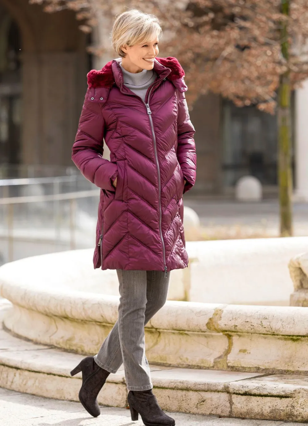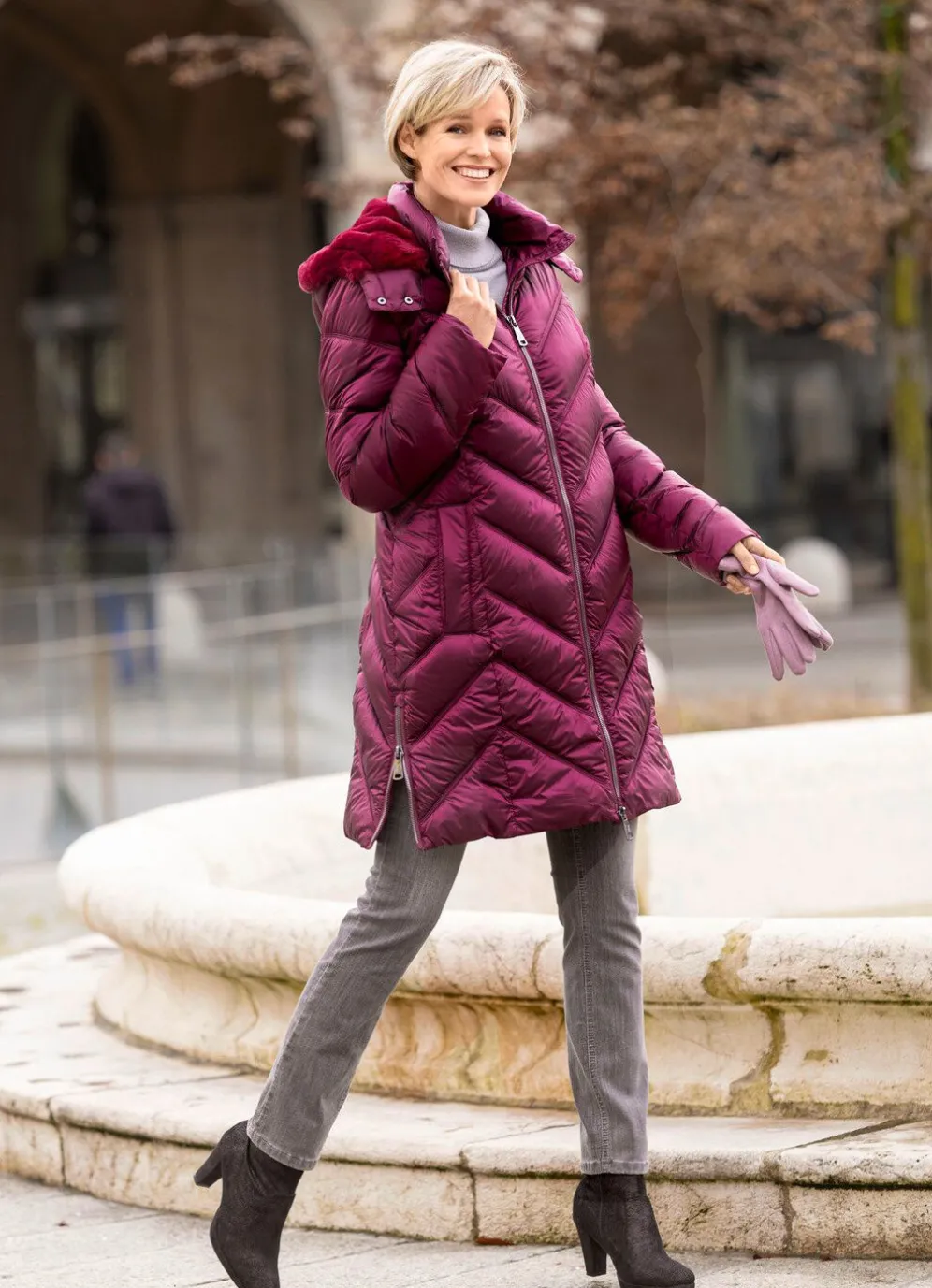 Dieser magentafarbene Kurzmantel punktet mit interessantem Zickzack-Stepp, Durchzugsband, Stopper, Riegel, Druckern und Kunstpelz-Innenausstattung in der abnehmbaren Kapuze, durch 2-Wege-Reißverschluss hoch schließbarem Stehkragen, Blende und verdecktem Drucker an den Schubtaschen, Reißverschluss an den Seitenschlitzen, umschlagbaren Ärmeln sowie einer Innentasche. Länge ca. 90 cm, ab Gr. 48 ca. 92,5 cm.
