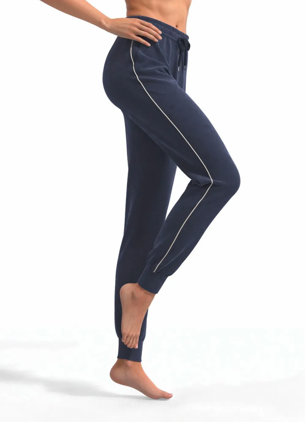 Kuschelig und warm zugleich ist diese „Plantier”- Hose mit breitem Dehnbund rundum, Bindeband, zwei Schubtaschen, weißer Paspel an den Seitennähten, breitem Bündchen an den Beinabschlüssen.