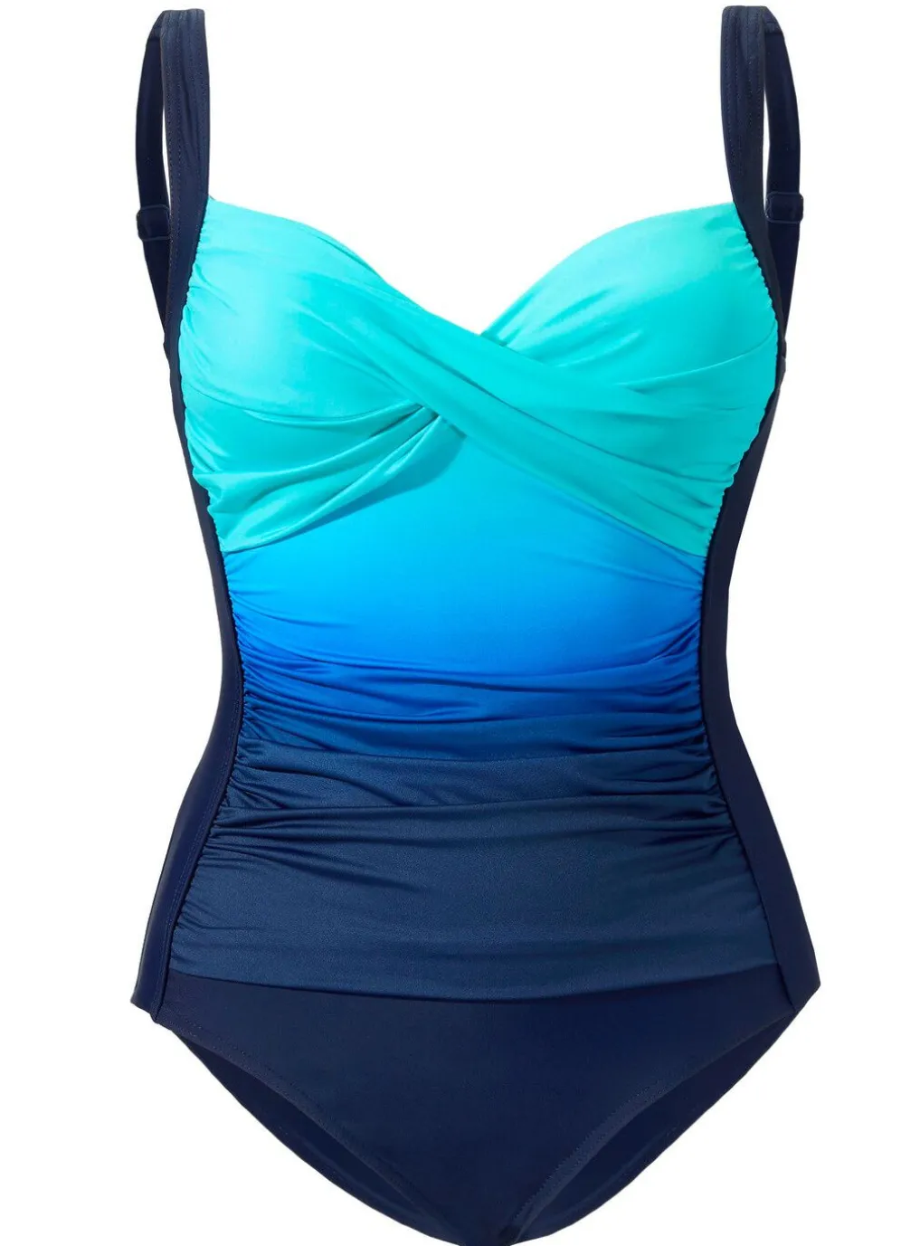 Hübscher, marinefarbener „Laurina“-Badeanzug mit buntem, gerafftem Vorderteileinsatz, leicht verschlungenem Büstenteil, verstellbaren Trägern, Halbkorsage, Softschalen und Unterbrustband.
